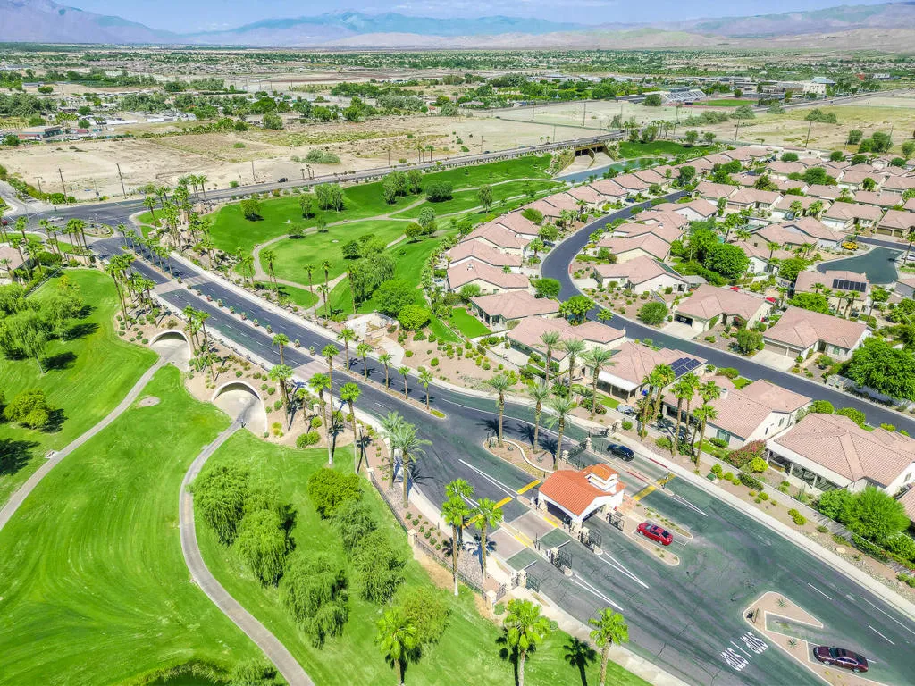Welcome to your desert retreat in Sun City Shadow Hills. This popular San Emilio plan 2BD + Den, 2BA welcomes you with 10-ft ceilings and sun-filled spaces. The chef’s kitchen is made for gathering featuring expansive granite counters, an 8-ft island, freshly painted white cabinetry, a roomy pantry off the breakfast nook, and a full suite of LG stainless appliances including dishwasher, cooktop, microwave, refrigerator, and double ovens. Throughout the home, you’ll find plantation shutters and luxury vinyl flooring.Slide open the doors from the living room or the private primary suite and step into a resort backyard on a 9,148 SF lot: salt-water PebbleTec pool with tanning shelf, spa, and an outdoor kitchenette/bar equipped with a mini-fridge, sink, drawers, lighting & TV beneath an Alumawood pergola, plus a putting green and misting system with surround sound. Bask in glowing west-facing sunsets and peekaboo mountain views. The primary suite features a walk-in closet and step-in shower; the guest bath offers a tub/shower combo. A 2-car garage + golf-cart space and a dedicated laundry room with sink and storage add everyday ease. Welcome home to vibrant, low-maintenance living in a premier 55+ community!