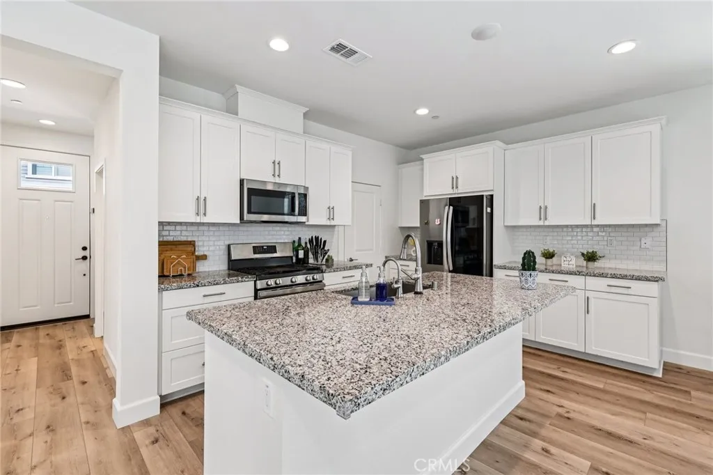 Inside, the open-concept floor plan is filled with natural light, highlighting the upgraded flooring, designer fixtures, and contemporary touches throughout. The spacious great room flows seamlessly into the dining area and chef-inspired kitchen, creating the ideal setting for entertaining. The kitchen is a true centerpiece, featuring a large island with seating, granite countertops, stainless steel appliances, a walk-in pantry, and ample storage.