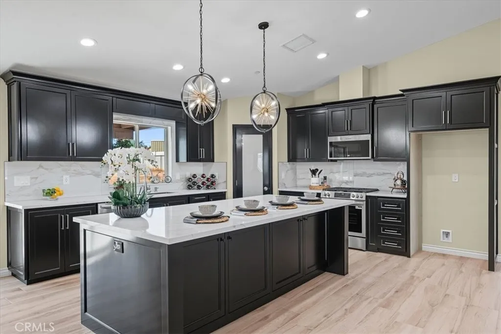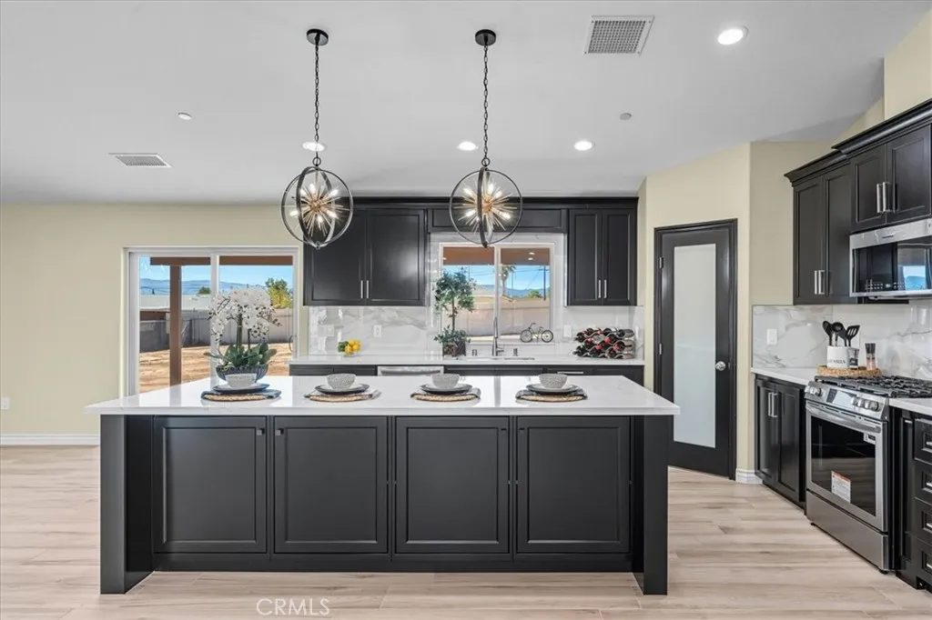 BRAND-NEW HOME WITH AN ELEGANT DESIGN LOCATED IN A QUIET NEIGHBORHOOD OF HESPERIA!! It features 4 large bedrooms and 2.5 Baths. Energy-Efficient Upgrades – Includes PAID SOLAR PANELS, LED lighting, double-glazed low-energy windows, a tankless water heater, fire sprinklers, and high-quality insulation for maximum efficiency. Open Floor Plan with beautiful ceramic Tile floor throughout. Spacious Kitchen with an Oversized Island (9’x4′) featuring an eating bar and decorative pendant lights above. Custom cabinets, self-close doors and drawers, a Trash drawer, and a large pantry with shelves. Beautiful Quartz countertops, backsplash, and Stainless-steel appliances. Large Main suite with room for a seating area and cozy carpeting, an elegant master bath full of natural light with separate tub and shower, a large mirror, and a spacious walk-in Closet with custom shelves.