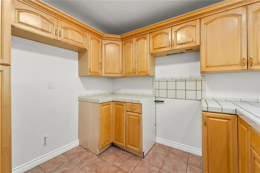 The kitchen features tile countertops and flooring, along with a dedicated dining area that overlooks the backyard. With multiple sliding doors throughout, the home creates a seamless flow between indoor comfort and outdoor living.