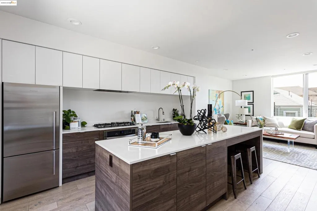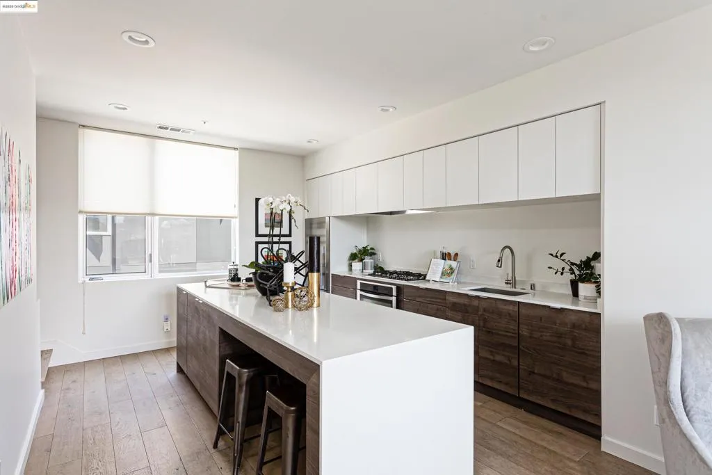 This uniquely European inspired city house is the modernist’s perfect nest. With three-bedrooms, two baths, this home is the epitome of style and efficiency. No HOA, and little maintenance, but plenty of style with quality features. Located a short walk from BART and A/C transit, the neighborhood is connected and convenient to neighboring Uptown, Downtown, and the Lake Merritt communities. Inside it’s exciting. Three levels offer wonderful options. Abundant closets, laundry, and polished concrete floors complete the space. Venture upstairs to an amazing kitchen. Flat panel custom cabinets, quartz counters, a stand-out island, built-in five-burner gas cooktop, built-in oven, and wood paneled dishwasher, will embrace a culinary masterpiece. There are distressed hardwood floors on level two and three, and a beautiful tiled bath upstairs. Off street parking included.