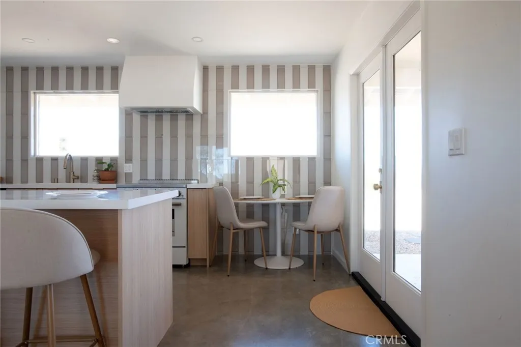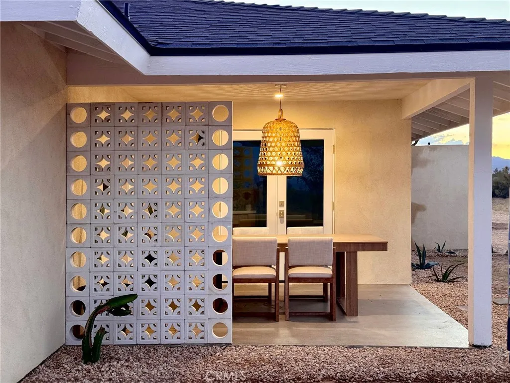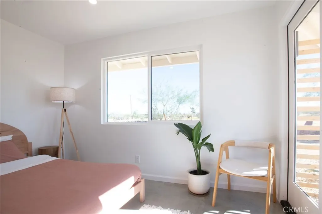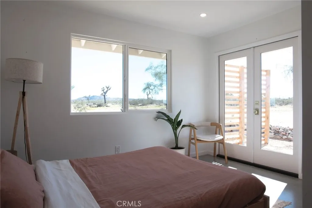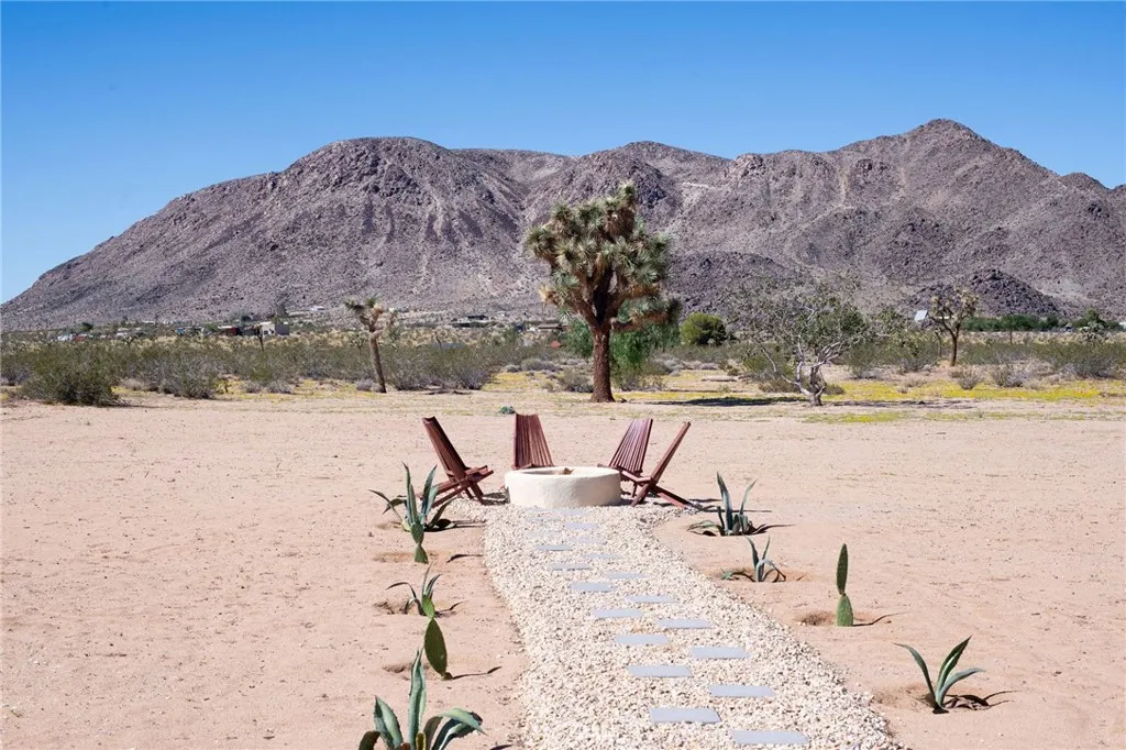 Welcome to 59676 Mitch Rd, where Bohemian Flair meets Desert Elegance. This gorgeous turn-key property has been completely remodeled with every feature intentionally chosen to bring you the perfect airbnb, desert home or weekend retreat. This house showcases 3 bedrooms, 2 bathrooms and 5 ACRES OF LAND with stunning panoramic desert & mountain views. Inside you’ll find sleek concrete floors, tasteful decor & furnishings, rounded archways, recessed lighting and large windows that let in an abundance of natural light. The warm and welcoming living room flows effortlessly into the awe-inspiring kitchen and dining area complete with designer-style tile backsplash, bright quartz countertops, beautiful modern cabinetry, high-end FORNO appliances and bar seating. Each bedroom is well appointed with mini-splits for year-round comfortability, closets with custom built-in shelving and 2 of the 3 bedrooms adorn french doors that lead to their own private outdoor patios. Both bathrooms boast spa-like showers with sophisticated tile, glass panels and lovely new vanities with clean, modern finishes. The finished garage has been transformed into the ultimate hangout space equipped with a bar, wine fridge, sink, additional cabinetry, a mini-split and a cozy elevated lounge area (there is even a stacked washer/dryer for added functionality). It doesn’t stop there; the serene outdoor living space includes a lovely covered patio for outdoor dining, an outdoor shower with a rainfall shower-head, ample space to entertain or relax around a firepit on a starlit summer night. Not to mention, there is more than enough room to build/expand and/or store all your desert toys! This exquisite property is located close to numerous desert attractions like Lander’s famous Goat Mountain hiking trails, Giant Rock, La Copine, The Integratron, and only 15 mins from downtown Joshua Tree but still far enough away to fully immerse yourself in all the peace & tranquility this desert home has to offer. Come take a look & let the desert’s allure do the rest. Your new desert home or weekend retreat awaits.