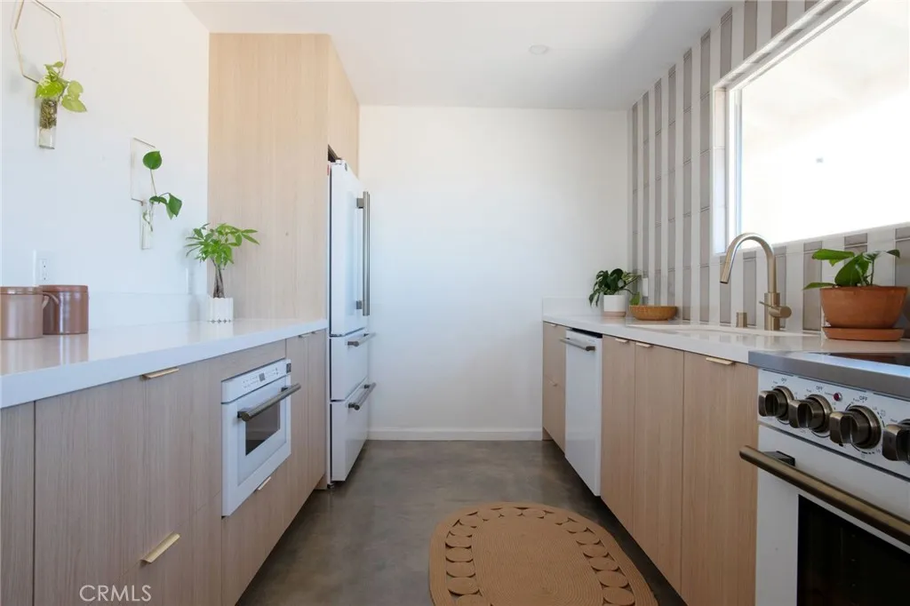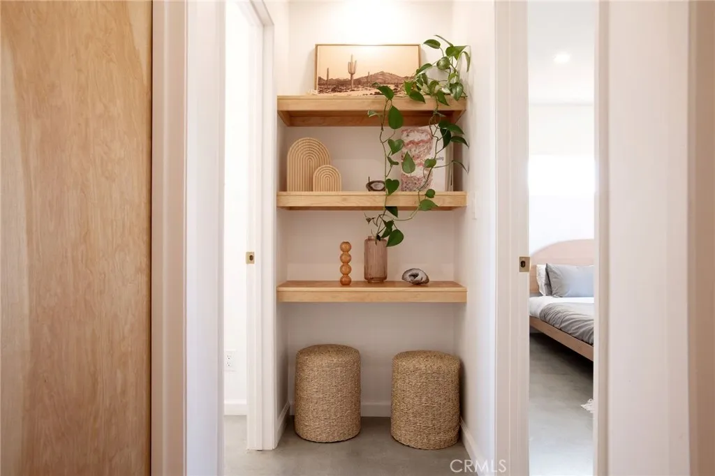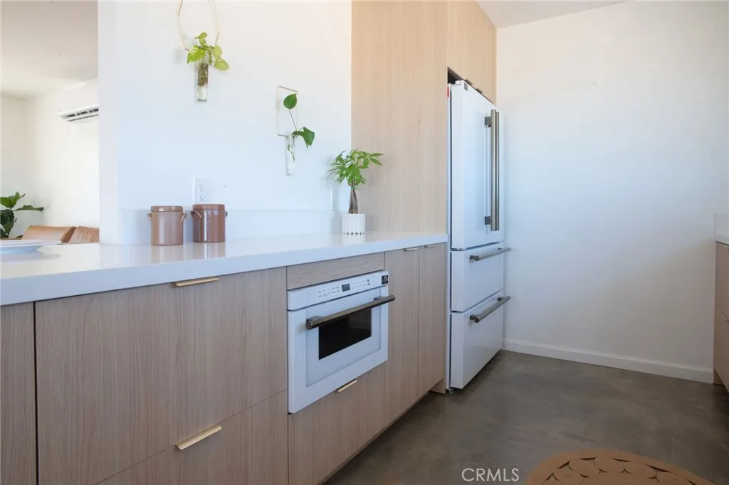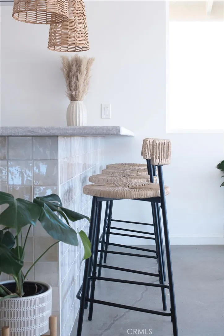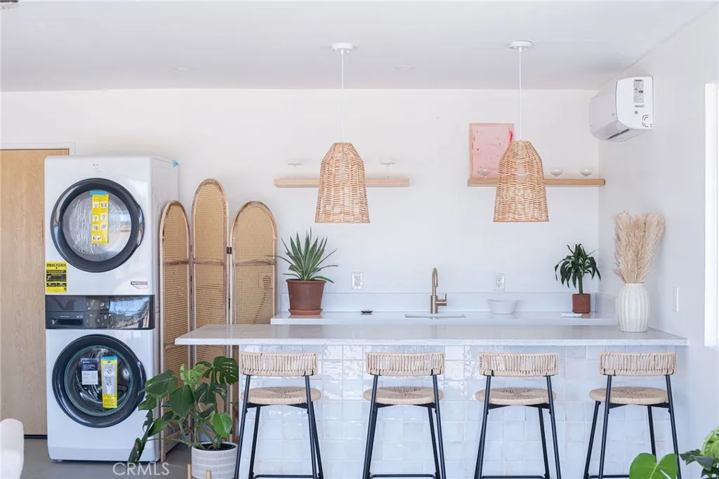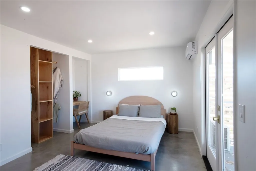 Welcome to 59676 Mitch Rd, where Bohemian Flair meets Desert Elegance. This gorgeous turn-key property has been completely remodeled with every feature intentionally chosen to bring you the perfect airbnb, desert home or weekend retreat. This house showcases 3 bedrooms, 2 bathrooms and 5 ACRES OF LAND with stunning panoramic desert & mountain views. Inside you’ll find sleek concrete floors, tasteful decor & furnishings, rounded archways, recessed lighting and large windows that let in an abundance of natural light. The warm and welcoming living room flows effortlessly into the awe-inspiring kitchen and dining area complete with designer-style tile backsplash, bright quartz countertops, beautiful modern cabinetry, high-end FORNO appliances and bar seating. Each bedroom is well appointed with mini-splits for year-round comfortability, closets with custom built-in shelving and 2 of the 3 bedrooms adorn french doors that lead to their own private outdoor patios. Both bathrooms boast spa-like showers with sophisticated tile, glass panels and lovely new vanities with clean, modern finishes. The finished garage has been transformed into the ultimate hangout space equipped with a bar, wine fridge, sink, additional cabinetry, a mini-split and a cozy elevated lounge area (there is even a stacked washer/dryer for added functionality). It doesn’t stop there; the serene outdoor living space includes a lovely covered patio for outdoor dining, an outdoor shower with a rainfall shower-head, ample space to entertain or relax around a firepit on a starlit summer night. Not to mention, there is more than enough room to build/expand and/or store all your desert toys! This exquisite property is located close to numerous desert attractions like Lander’s famous Goat Mountain hiking trails, Giant Rock, La Copine, The Integratron, and only 15 mins from downtown Joshua Tree but still far enough away to fully immerse yourself in all the peace & tranquility this desert home has to offer. Come take a look & let the desert’s allure do the rest. Your new desert home or weekend retreat awaits.