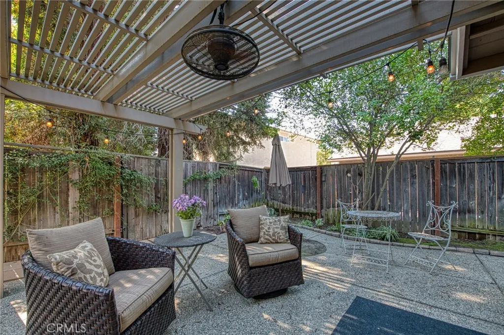 Renovated in 2023, both bathrooms mirror the kitchen’s aesthetic with matching white vanities, granite surfaces, and updated sinks and mirrors. Step outside to a freshly painted exterior (2025) featuring a new garage door and opener. The backyard is designed for easy upkeep and outdoor enjoyment, complete with an aggregate patio, lush green patch, and a shaded pergola — perfect for relaxing afternoons.