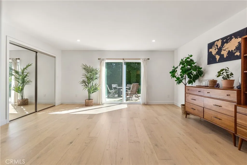 Large sliding glass doors in the living room lead to a beautifully tiered backyard, ideal for both relaxing and entertaining.