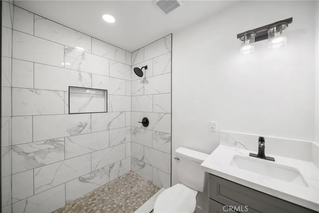 The second home (ADU) has been completely reconstructed and remodeled, featuring 3 large bedrooms and 2 modern bathrooms, each with walk-in tiled showers. The kitchen is equipped with quartz countertops, new cabinetry, refrigerator, stove, microwave, and dishwasher. Laundry hookups are located in the kitchen closet.