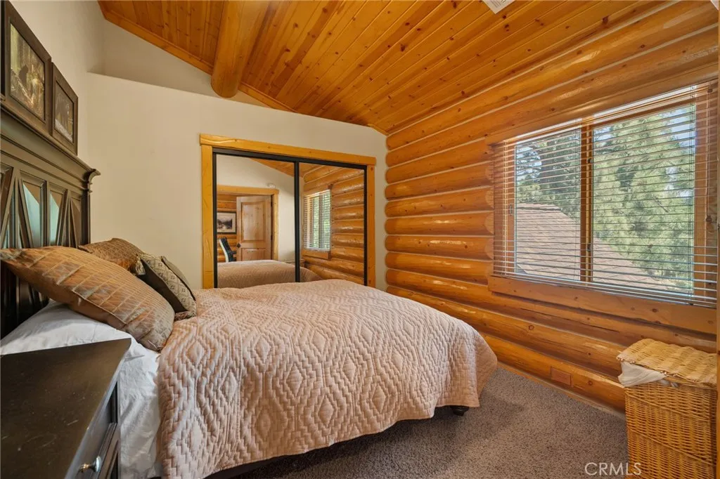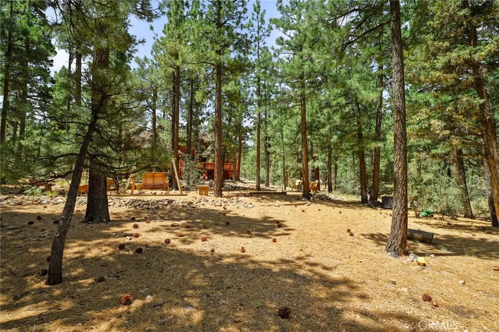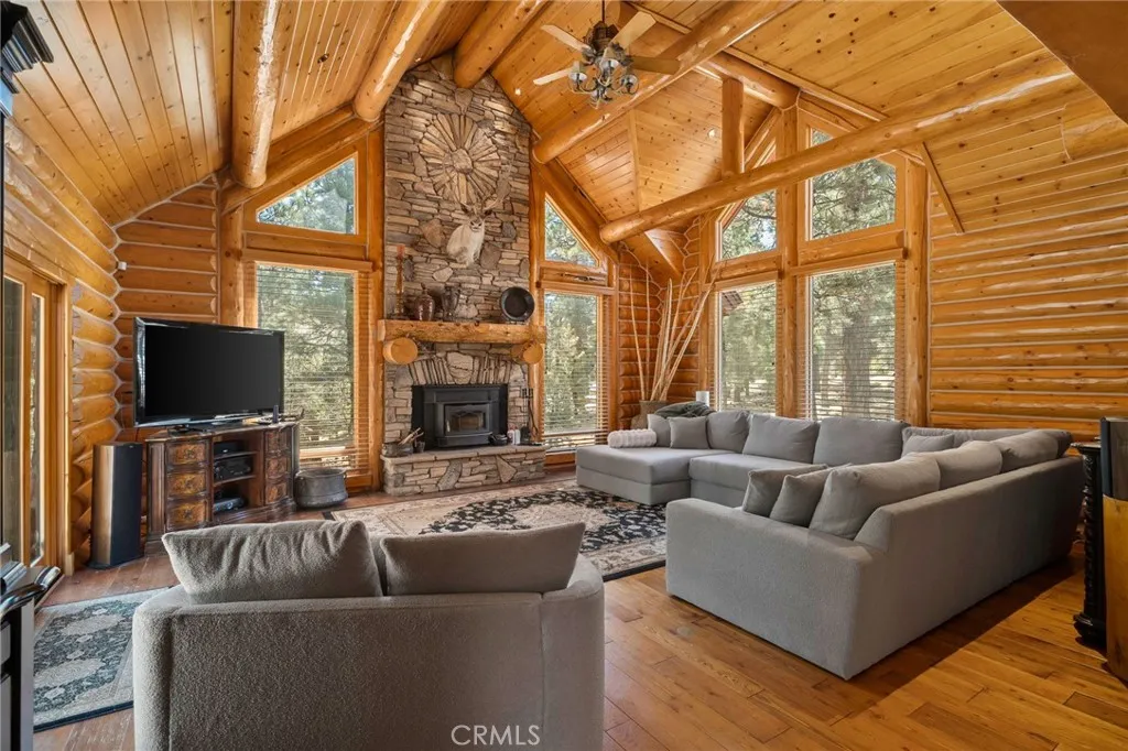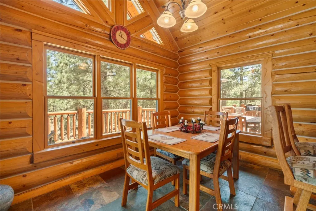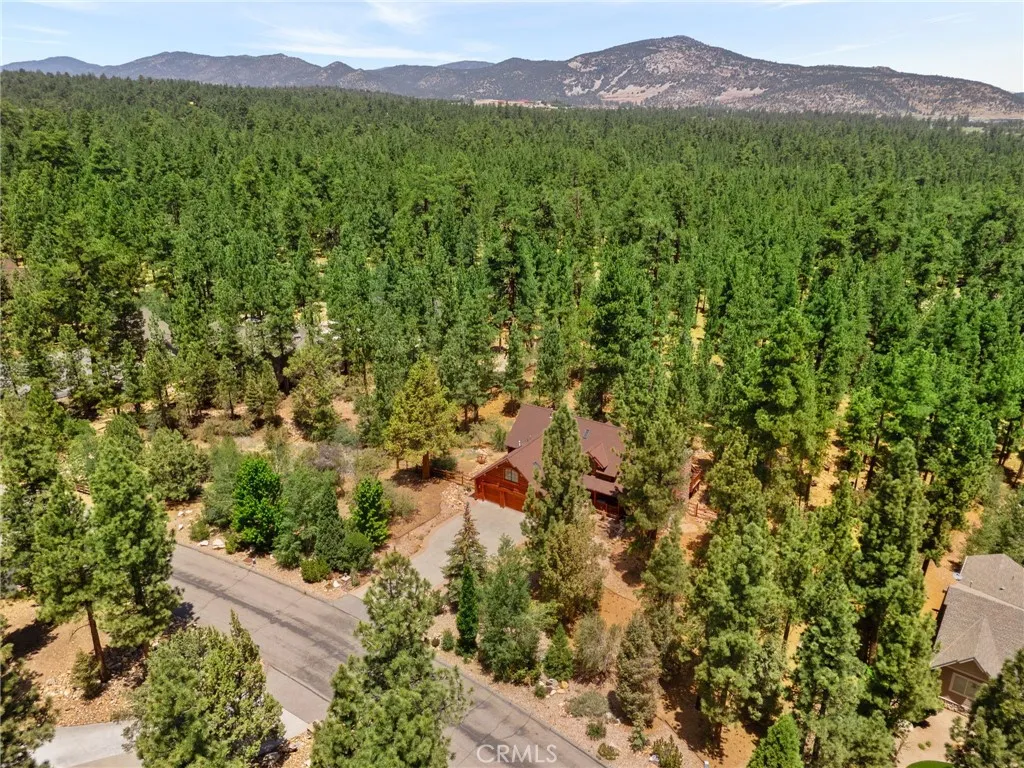 Set among the tall pine trees of Meadowbrook Estates in Big Bear City, this beautifully crafted two-story, log-style cabin offers over 3,262 square feet of living space on a spacious 1.26-acre lot. This 5-bedroom, 3.5-bathroom home is fully furnished and ready to enjoy as a full-time residence, weekend getaway, or vacation rental. A welcoming log-accented entryway opens into a warm and inviting main level that features a grand living room with soaring ceilings, expansive windows that fill the space with natural light, and a floor-to-ceiling wood-burning fireplace. The open-concept layout continues into a large kitchen, complete with granite countertops, stainless steel appliances & dual sinks. Adjacent to the kitchen is a cozy breakfast nook with bar-height seating, as well as a formal dining area that overlooks the backyard and opens to a spacious deck through sliding glass doors. The main floor also includes a generously sized primary suite with its own fireplace, jetted tub, walk-in shower, dual sinks, and walk-in closet. A half bath for guests and a separate laundry room are also located on the first floor. All main-level rooms—including the primary suite, kitchen, dining room, and living room—offer direct access to the backyard through individual exterior doors, creating a seamless indoor-outdoor connection. Upstairs, you’ll find a junior suite with its own private bathroom and walk-in shower, along with three additional bedrooms that share a full guest bathroom featuring dual sinks and a standard bathtub. A generous loft area with a wet bar provides flexible space for entertaining, lounging, or game nights. Just off one of the bedrooms, there’s also a dedicated office or bonus space—ideal for working remotely or creating a quiet retreat. The home also features a spacious three-car garage and plenty of outdoor space, surrounded by tall pine trees that offer privacy and a true sense of mountain living. Whether you’re entertaining, relaxing, or simply taking in the quiet natural setting, this property provides the perfect backdrop. Located just 10 to 15 minutes from Big Bear Lake, ski resorts, hiking trails, and local shops, you’ll enjoy the ideal blend of peaceful seclusion and easy access to everything Big Bear has to offer.
