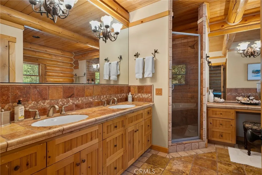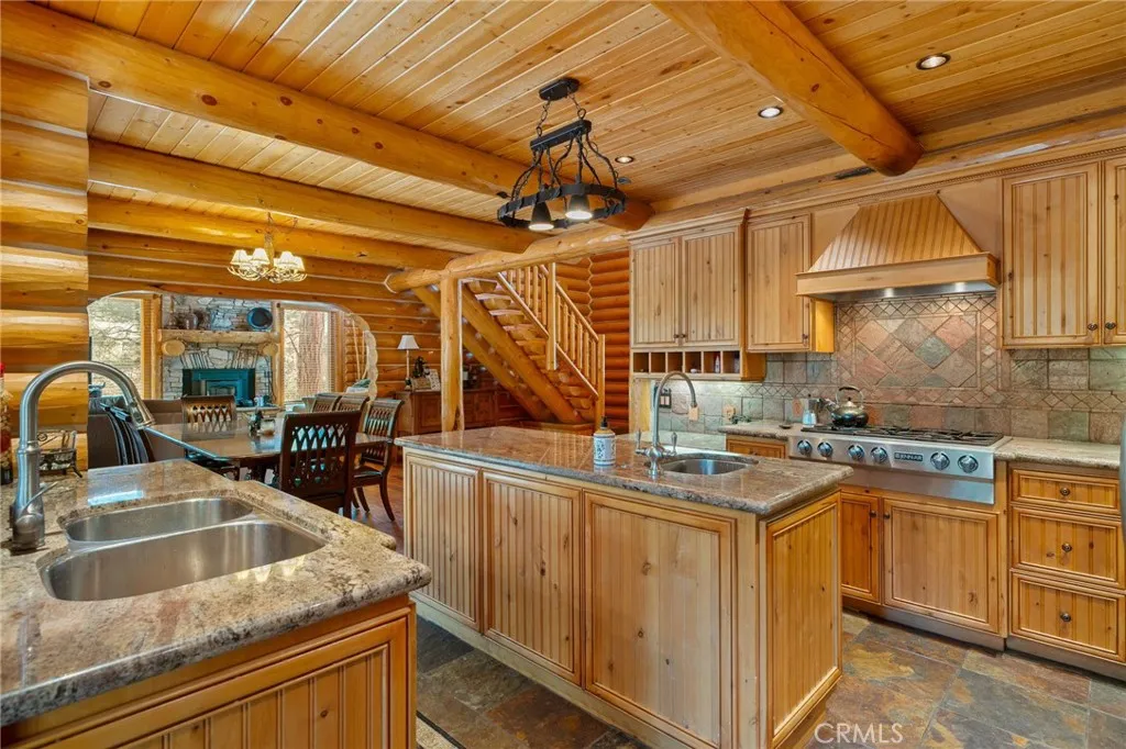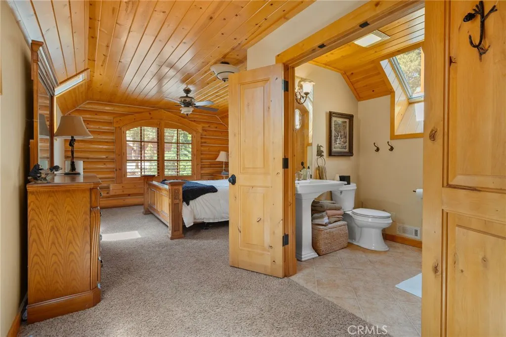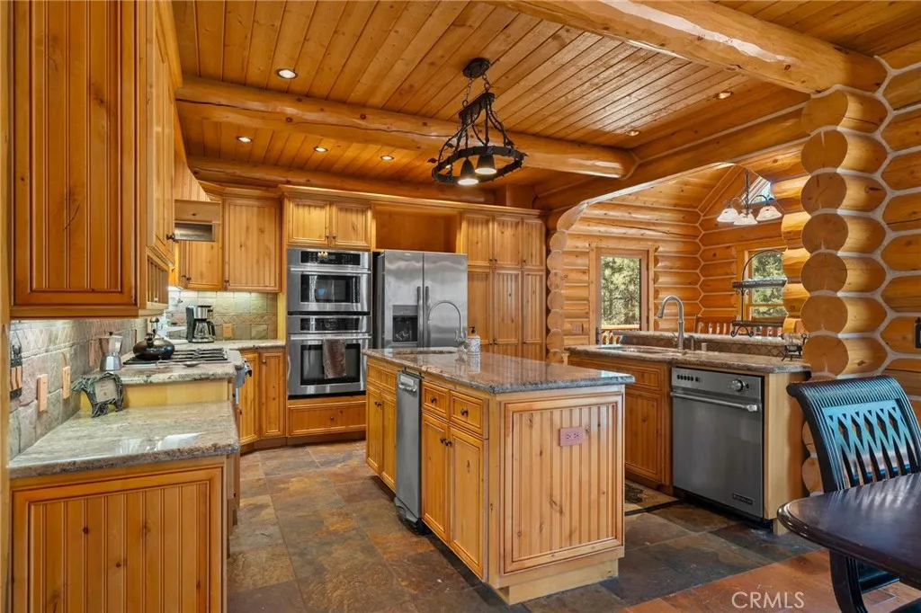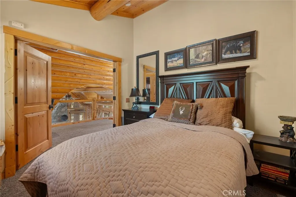 Set among the tall pine trees of Meadowbrook Estates in Big Bear City, this beautifully crafted two-story, log-style cabin offers over 3,262 square feet of living space on a spacious 1.26-acre lot. This 5-bedroom, 3.5-bathroom home is fully furnished and ready to enjoy as a full-time residence, weekend getaway, or vacation rental. A welcoming log-accented entryway opens into a warm and inviting main level that features a grand living room with soaring ceilings, expansive windows that fill the space with natural light, and a floor-to-ceiling wood-burning fireplace. The open-concept layout continues into a large kitchen, complete with granite countertops, stainless steel appliances & dual sinks. Adjacent to the kitchen is a cozy breakfast nook with bar-height seating, as well as a formal dining area that overlooks the backyard and opens to a spacious deck through sliding glass doors. The main floor also includes a generously sized primary suite with its own fireplace, jetted tub, walk-in shower, dual sinks, and walk-in closet. A half bath for guests and a separate laundry room are also located on the first floor. All main-level rooms—including the primary suite, kitchen, dining room, and living room—offer direct access to the backyard through individual exterior doors, creating a seamless indoor-outdoor connection. Upstairs, you’ll find a junior suite with its own private bathroom and walk-in shower, along with three additional bedrooms that share a full guest bathroom featuring dual sinks and a standard bathtub. A generous loft area with a wet bar provides flexible space for entertaining, lounging, or game nights. Just off one of the bedrooms, there’s also a dedicated office or bonus space—ideal for working remotely or creating a quiet retreat. The home also features a spacious three-car garage and plenty of outdoor space, surrounded by tall pine trees that offer privacy and a true sense of mountain living. Whether you’re entertaining, relaxing, or simply taking in the quiet natural setting, this property provides the perfect backdrop. Located just 10 to 15 minutes from Big Bear Lake, ski resorts, hiking trails, and local shops, you’ll enjoy the ideal blend of peaceful seclusion and easy access to everything Big Bear has to offer.