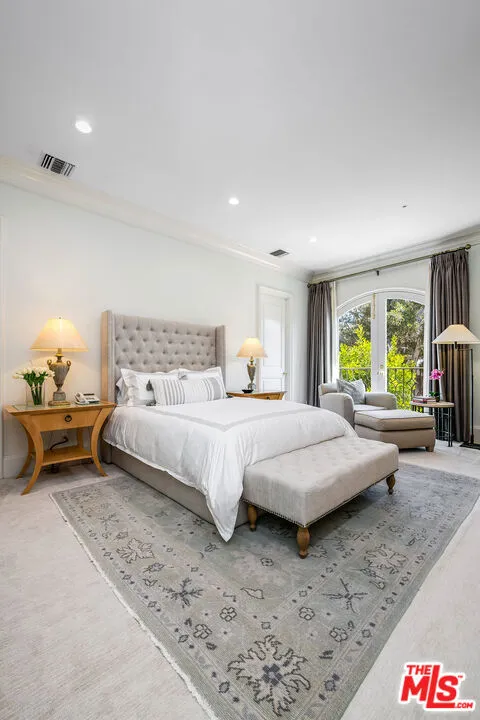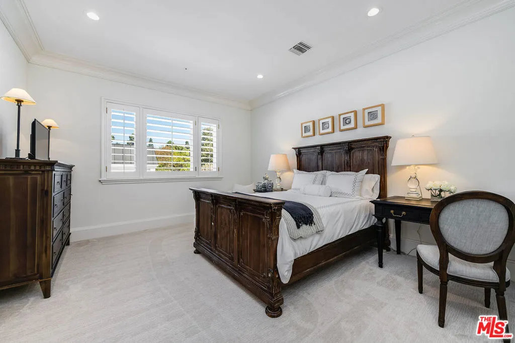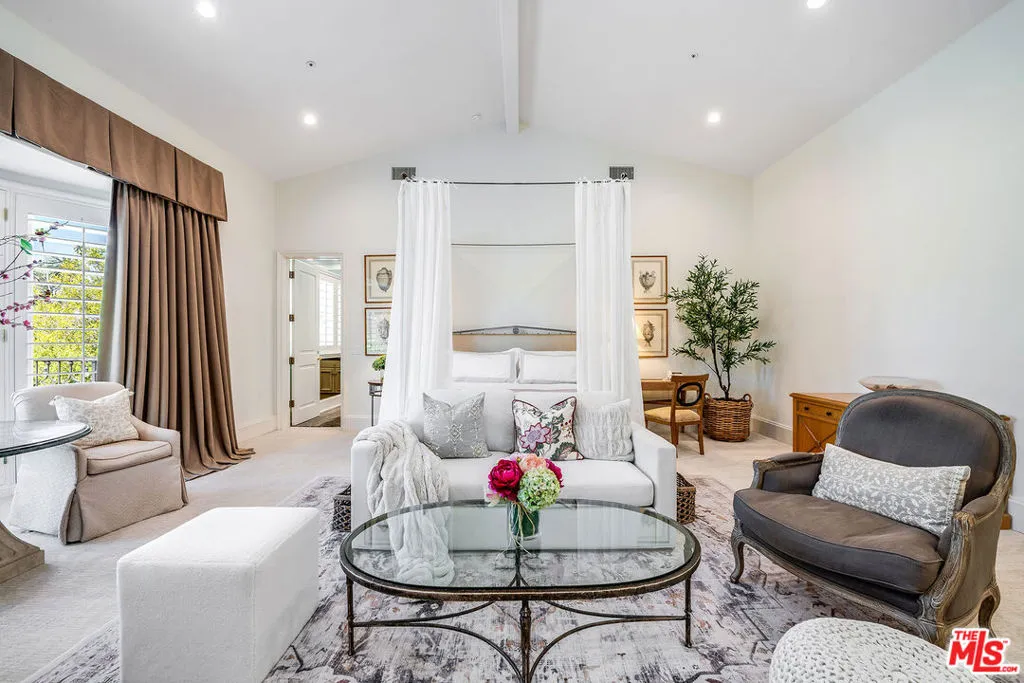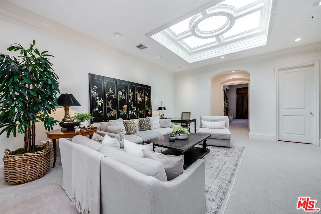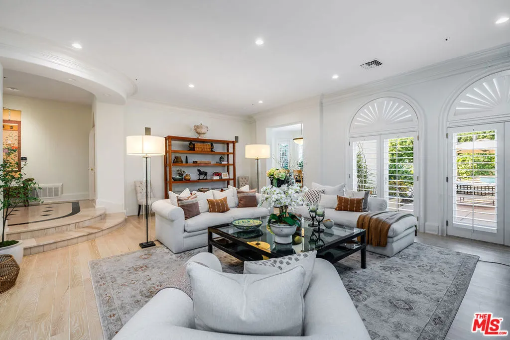Behind double front gates in prime Beverly Hills just North of Sunset Boulevard, this grand Contemporary Villa, built in 1991 by renowned builder Martin Selko and designed by Sheri Schlesinger, showcases exquisite curb appeal and timeless elegance. A sweeping motor court, two-car garage, and lush landscaping set the stage for the estate’s impressive presence. The residence opens to a dramatic two-story foyer with intricate marble floors, skylight, and a sweeping staircase. Sunlit rooms with soaring ceilings, fine moldings, and French doors create a bright, inviting atmosphere throughout. The formal living room with fireplace and a handsome library/office with custom paneling provide refined spaces for entertaining and work. Wide hallways and generous wall space are ideal for art display. At the heart of the home lies the expansive gourmet kitchen, featuring a large eat-in island, professional-grade appliances, and a cheerful breakfast room. The kitchen flows into the spacious family room with fireplace and built-in bar. The outdoor oasis offers a dining gazebo, pool, spa, patios, and manicured lawn, perfect for entertaining or relaxing in privacy. Upstairs, a skylit landing opens to a secondary family room. Three guest or family bedroom suites, each with en-suite baths, accompany the luxurious primary suite with fireplace, dual marble bathrooms, two room-sized walk-in closets, and a private balcony overlooking the grounds. A staff/maid’s suite is conveniently located on the main level. The estate is offered furnished with exquisite pieces by J. Robert Scott, enhancing its sophisticated interiors with refined style and comfort. This exceptional lease combines elegance, comfort, and distinguished design with a premier Beverly Hills location, moments from world-class shopping, dining, and entertainment.