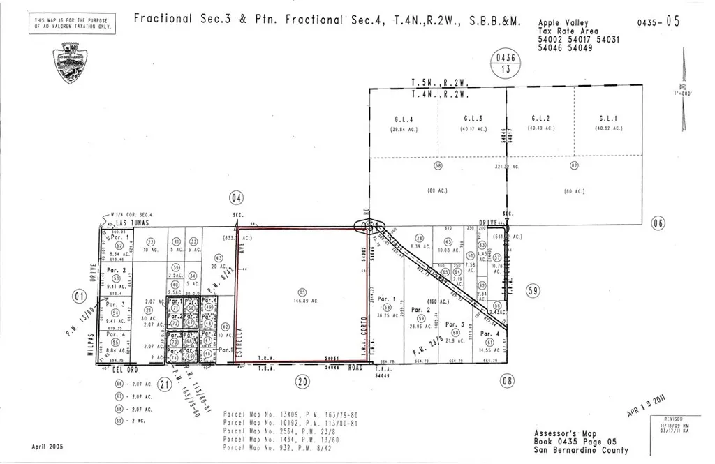 Rare opportunity to acquire ±146.89 acres of flat, developable land in the fast-growing Apple Valley area. Located along Del Oro Rd, the property is surrounded by open desert views and large ranch-style estates, offering an ideal setting for residential subdivision, ranch development, or land banking investment. Zoned RL-10, the parcel allows single-family homes on 10-acre minimum lots, as well as agricultural or equestrian uses. Electricity is available along the property boundaries, and water service is provided by the Mojave Water District. Its flat, rectangular shape provides excellent flexibility for phased development or long-term holding.