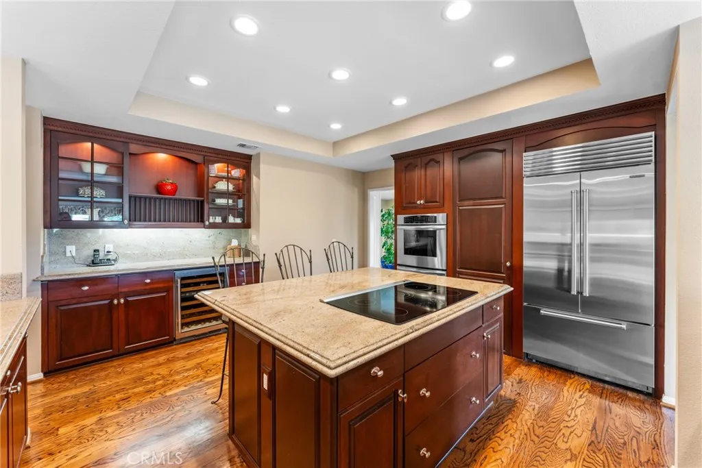 The chef’s kitchen boasts granite counters, a large island, walk-in pantry, sliding drawers, and Sub-Zero appliances including a refrigerator and dual-zone wine cooler. The in-law floor plan features two east-wing bedrooms, while the private west-wing primary suite offers a true retreat with a fireplace, walk-in closets, ensuite spa-style bathroom, and French doors opening to a private patio with a built-in spa. Step outside to a resort-inspired backyard designed for unforgettable gatherings. Highlights include a massive Trex deck, an oversized gated pool and spa, and a sunken courtyard with gazebo—the perfect setting for outdoor dining, weddings, or private events. The grounds also feature upgraded landscaping, a circular driveway, generous RV parking with hookups, and a flourishing orchard with avocado, blood orange, grapefruit, peach, cherry, tangerine, and pomegranate trees. Located near the prestigious Redlands Country Club, with access to nearby Teddy’s Trail and Oak Ridge Trail and the top-rated Redlands Unified School District, this estate offers the ultimate blend of luxury, privacy, and convenience. A rare opportunity to own a multi-generational entertainer’s dream home in Redlands, CA.