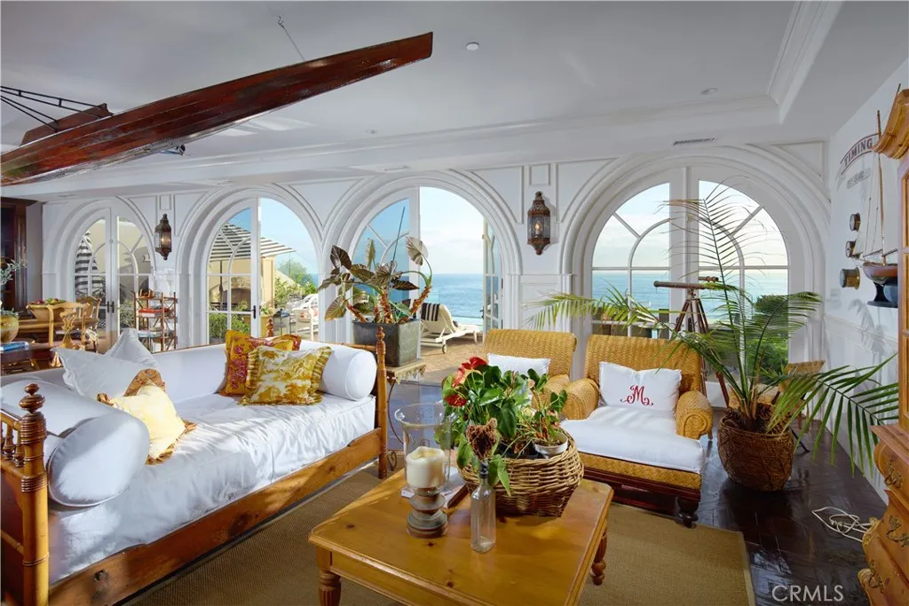 This European-inspired oceanfront home by interior designer Sue McKeehan and Architect Marshall Ininns is in the 24-hour guard gated beachfront community of Niguel Shores in Monarch Beach. Infused with antique details and the finest finish materials, the old world feeling is evident everywhere in the home, starting in the entry courtyard with its black and white marble floor, 12-foot high wrought iron and glass doors, and kitchen with an antique sway-backed French basin inserted into an old French chopping block. The endless panoramic views mesmerize from all three levels of the house; on the main floor, the sheer wall of glass allows the sun and water to filter into the kitchen and living room areas that are adjacent to it, on the upper level the oceanfront primary suite feels like you are on the bridge of an ocean liner, and from the lowest floor, the family room looks out onto the water and from this level one can walk out to the outdoor living space with its fireplace pool and steps to the private beach. The home’s main level features untreated marble, a large great room with an antique fireplace, and the kitchen, which has a sweeping view and is perfect for everyday living and hosting on a grand scale. The home’s upper level features three family bedrooms with en-suite baths, a study, and a dramatic primary suite with a retreat, fireplace, and elegant marble bath. The lower level of the home is all about entertaining with a theater, gym, wine room, guest suite, and playroom with a bar, built-ins, and a huge entertaining room. Niguel Shores is an active lifestyle community with private beach access, a clubhouse, a swimming pool, tennis courts, pickleball courts, playground, and numerous athletic amenities. All the fun of the beach is outside your door, swimming, surfing, paddle boarding, volleyball, and just an easy walk to the world famous Ritz Carlton Hotel.