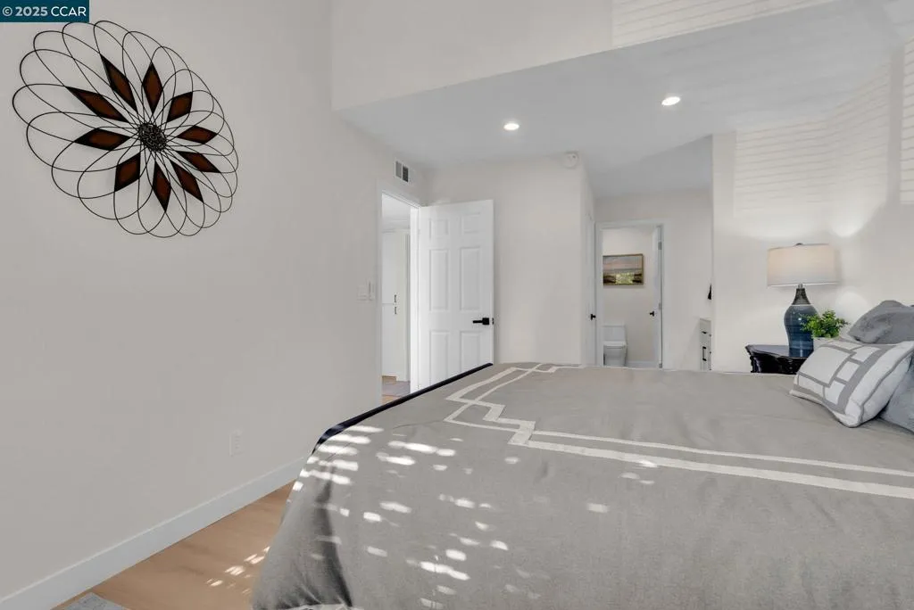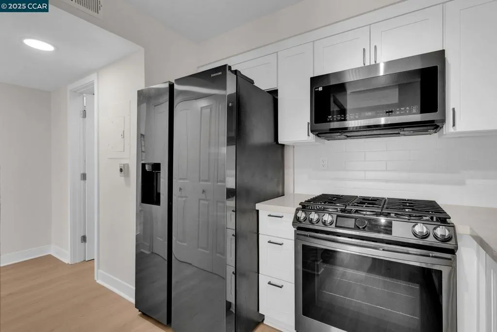 Absolutely stunning, fully updated 2-story, townhouse-style end unit condo facing common area in the heart of Hercules. Updated prior to seller purchasing. Beautiful kitchen w/quartz counters, ample cabinets, upscale appliances, gas stove. Lots of natural light in spacious living rm/dining area. Fireplace w/gas starter, new central A/C installed in 2024, ceiling fans in each bedroom. Primary bedroom has modern en suite w/dual sinks, updated shower stall & walk-in closet. Upstairs hall bath also has dual sink. New low-maintenance vinyl flooring thruout downstairs, new carpet in 3rd BR. In-unit laundry closet. Private patio. Spacious 2-car detached garage for parking & storage. Multiple community pools w/hot tub & community tennis courts. One pool is just steps away. Must see this gorgeous condo that exudes elegance & serenity. Walking trails to waterfront w/beautiful bay views. Close to freeway access, shopping, restaurants & amenities. This is truly a 10–don’t miss out!