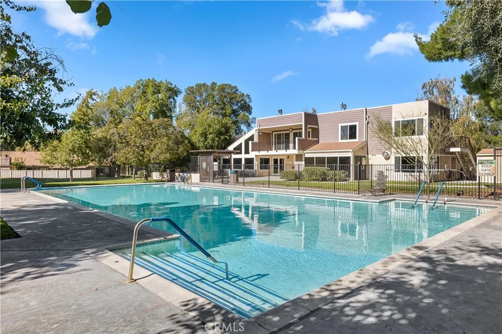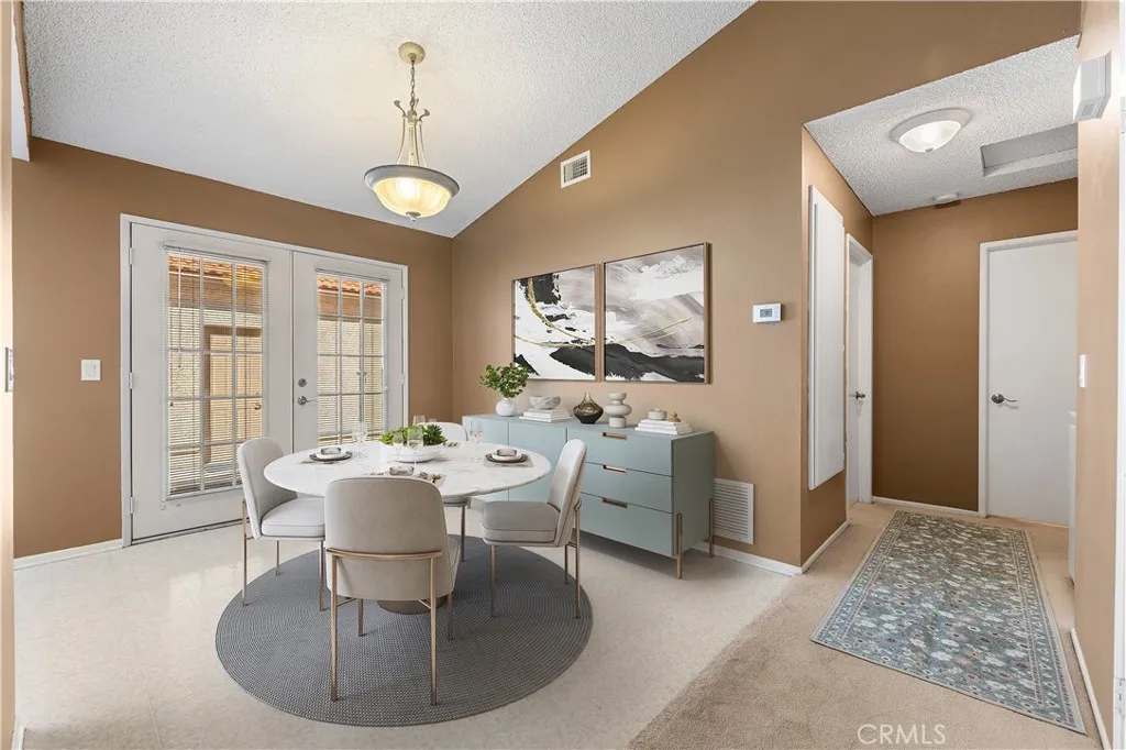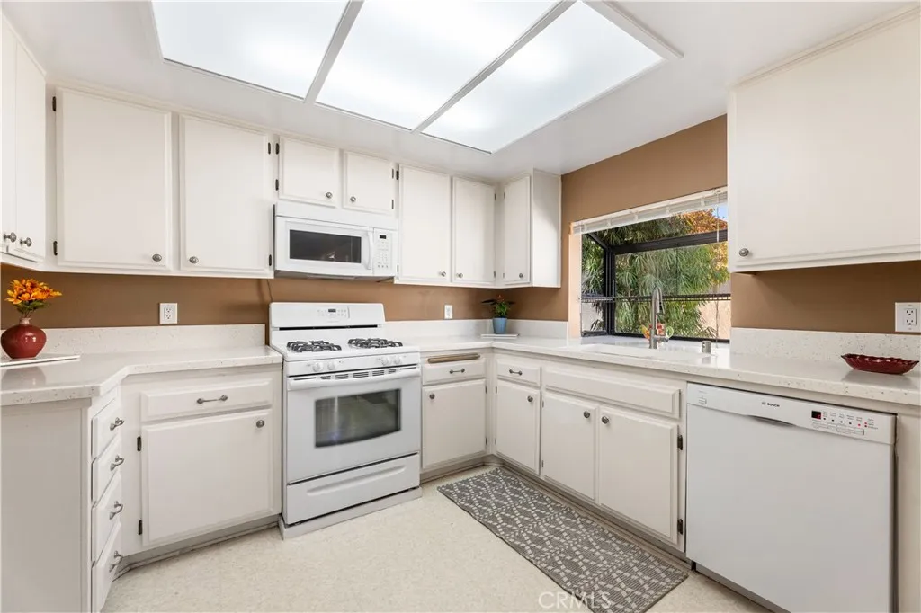Offered here is a single-story, 2-bedroom, 2-bathroom end unit condominium in move-in condition. The front door is tucked away off the quiet, low traffic, tree-lined cul-de-sac for even greater privacy, and a step inside reveals a big, bright and airy living room with a gas-powered fireplace under a custom-made mantle and a vaulted ceiling. The open floor plan gives access to a kitchen featuring a light-catching garden window, plenty of counter and cupboard space, including a well-located pantry, and included stovetop/oven, microwave, and dishwasher. The adjoining dining area, via lovely French doors, looks out to a sunny private courtyard for outdoor dining, activities, or entertainment.