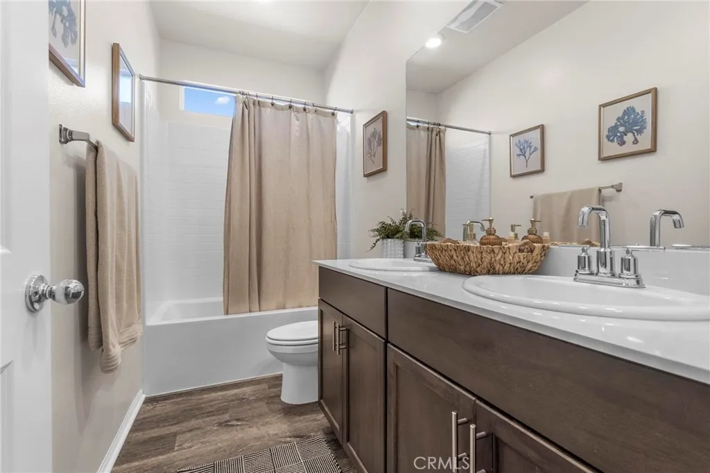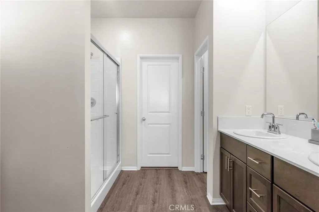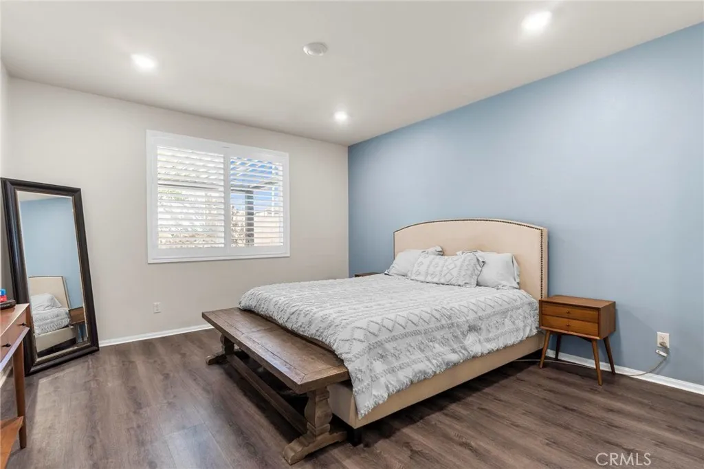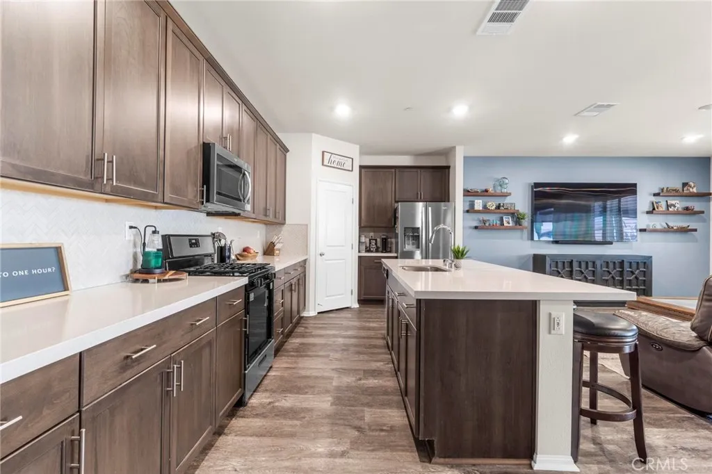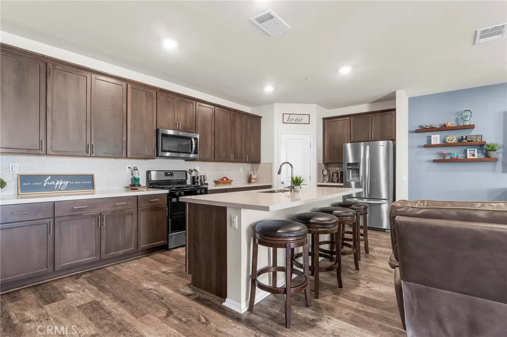 Welcome to this stunning single story home that perfectly blends comfort, stye and functionality. Featuring 4 spacious bedrooms and 2 full bathrooms, this home offers and open concept floor plan ideal for modern living. The bright and airy living area seamlessly flows into the dining space and contemporary kitchen with an oversized island with jasmine white quartz countertops, perfect for entertaining family and friends. This home also features smokey oak EVP flooring. Enjoy a large primary suite with a private ensuite bath and generous closet space. Additional bedrooms provide flexibility for a home office, guest room or playroom. Step outside to a private backyard with custom pavers and a cantilever patio cover ready for outdoor gatherings or simply relaxing after a long day. Its thoughtful layout and single-level design, this home offers convenience and comfort for every stage of life. This home is energy-efficient with paid off solar and is move-in ready and located in a desirable neighborhood close to schools, parks, and shopping— this home is a must see!