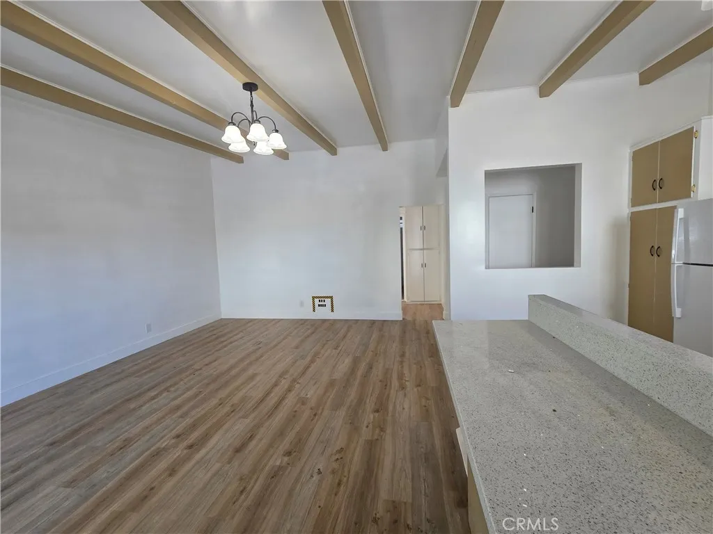 Welcome to this beautifully renovated second-floor 1-bedroom, 1-bath apartment in the heart of Sherman Oaks. This light-filled unit features soaring vaulted beam ceilings, stylish wood-look flooring throughout, and a spacious open-concept layout. The updated kitchen offers clean lines and modern finishes, seamlessly flowing into the living area and out to a private balcony through an oversized sliding glass door. The full bathroom includes contemporary upgrades with a combination tub and shower. The bedroom is generously sized with a large mirrored wardrobe closet and abundant natural light. Additional amenities include community laundry and one covered parking space. Conveniently located near shops, dining, and major freeways—this is elevated Valley living at its best.