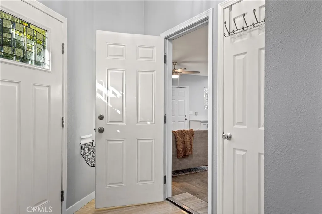 The main residence features three spacious bedrooms and two full baths. A direct doorway from the second bedroom opens into the backyard, offering serene access to the outdoor environment. Discover abundant built-in cabinetry and deep storage closets with shelves throughout — making organization effortless and clutter a thing of the past. Step into the inviting living room where a cozy wood-burning fireplace insert warms the space, and a generous window-seat with built-in storage invites you to relax, lounge or catch up on the day.