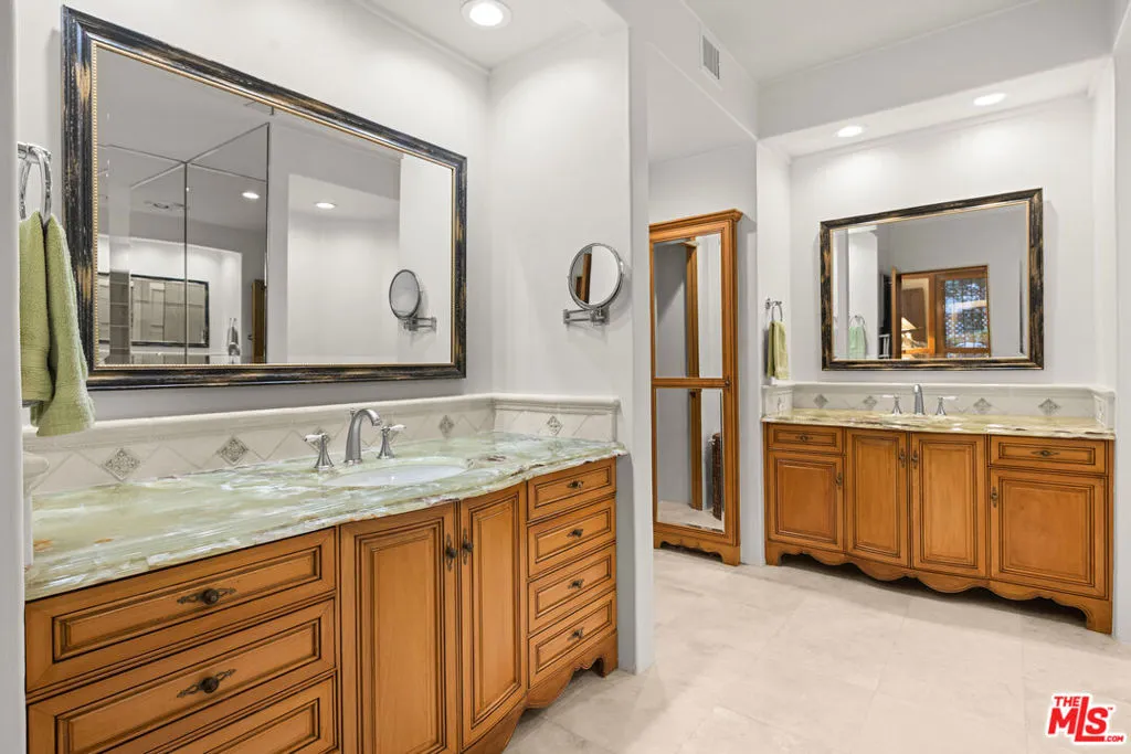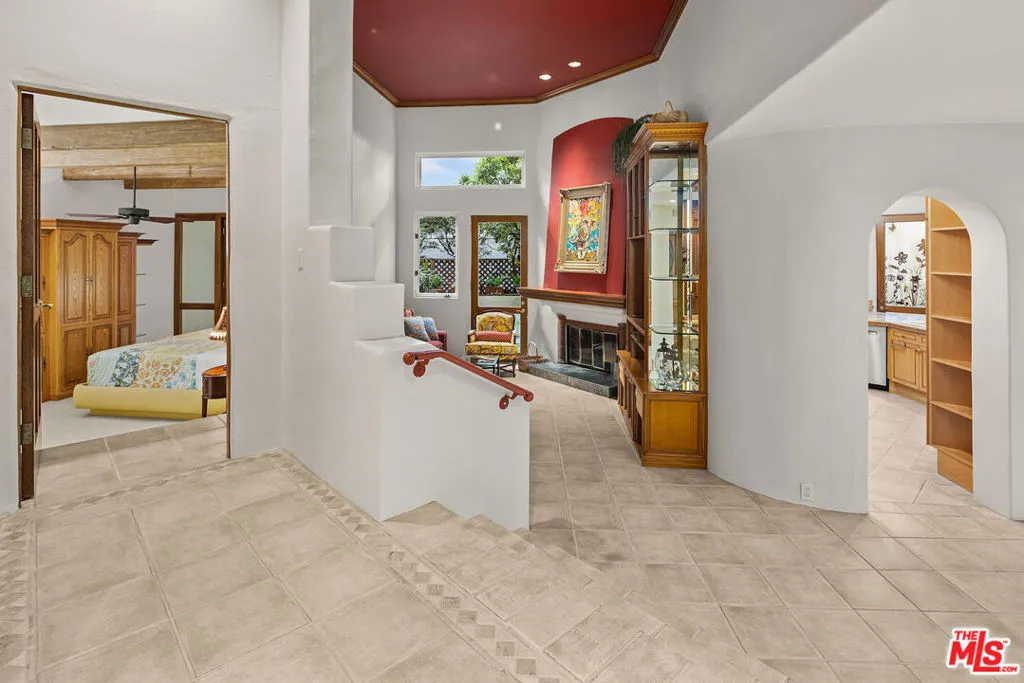 Wonderful opportunity to lease right in the heart of the Palisades while you are rebuilding! Controlled access iconic building completely remediated, freshly painted and available immediately for one or two year lease. Furniture available, but can be moved out if preferred. Terrific wrap around patio makes it feel like a real home. Two large bedrooms on separate sides of the condo, one has been used for a den/office with a Murphy bed. Primary bedroom has patio access and a large dual sink bathroom and walk-in closet. Full size washer and dryer in the unit. High ceiling living room, charming dining area, eat in kitchen with center island. Two assigned parking spaces in underground garage, accessed with clicker that opens and closes the gate. The 19 unit complex is known for its beautifully maintained courtyard with Hacienda style landscaping.