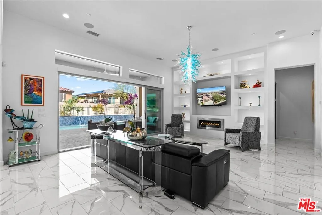 Welcome to 14 Merlot, located in a quiet pocket of Del Webb Rancho Mirage. Walking distance to the club house, where all the action takes place. This home is over 2500 sq ft of living space, it is an expanded version of the Journey model. When you arrive at this welcoming home, you see clean, detailed lines directing you to the fireplace in the living room and an outdoor oasis. The sparkling blue water pool is one of the longest in the community. It also has a spa and waterfalls. 2 Pergolas, covering the built in BBQ island outdoor kitchen. Inside the home, the kitchen is equipped with not one, but has 3 ovens, 2 full size and one convection. It is perfect for cooking your favorite meals. You will also see the largest Range from Kitchen Aid, stylish Quartz countertops throughout the home and backsplash in the kitchen. Ceramic tile flooring thought-out this home, the living room has a custom built in shelving with lighting, the home is pre-wired and a smart home. One of the most exciting things is the Premium stackable sliding doors, bring the outdoor in. Simply marvelous, as you enter the Primary bedroom, you see a second fireplace and an additional door to the outdoor playground. The spa like shower and large closet enhance the space. There is a casita/2nd bedroom has it’s own entrance for your guests. The Office/den can be used as a 3rd bedroom. If you are looking for a home that is move-in ready, filled with the highest end of upgrades, this is it. There are 38 solar panels leased at $277.00/month. Do not miss this rare home.