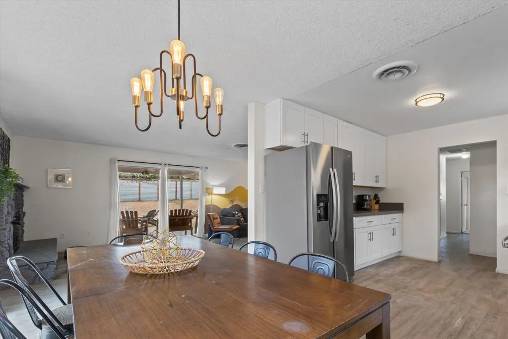 Located in Yucca Valley’s picturesque Storey Park neighborhood, this 3-bedroom, 2-bath home sits on a near half-acre and offers an updated interior and a bright, open layout. Enjoy an inviting modern kitchen with sleek quartz countertops, stainless steel appliances, and abundant cabinet space. The dining area flows seamlessly into the living room, which is adorned with a large, beautiful stone fireplace and sliding doors that open to a covered patio. The spacious primary bedroom has generous closet space and an en-suite bath. Both guest rooms are well-sized and share the updated guest bath. The 2-car garage, currently utilized as a game room, offers laundry tucked conveniently inside. Out back, you’ll enjoy the fully fenced yard, complete with tree-house, swings, fire pit, beautiful mature trees (including Olive and Joshua Trees) and a 15′ vehicle gate has plenty of room to add amenities as you see fit. Just minutes from local shopping, dining, and Joshua Tree National Park
