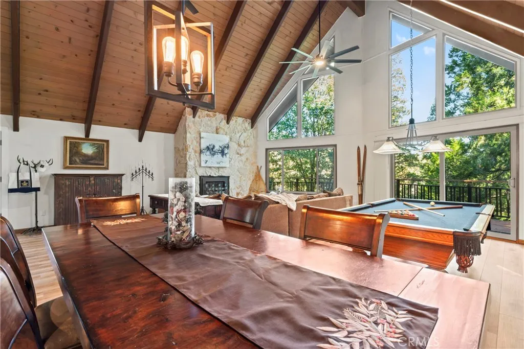 Phenomenal Prow Style home located directly across from the forest and trails, with easy access to the golf course just down the street. This property also includes Lake Rights, allowing full use of beautiful Lake Arrowhead. Over $300,000 in upgrades, including a recently remodeled kitchen with high-end professional-style appliances, slab quartz countertops, and a garden bay window overlooking mature evergreens and oaks on your own land. The home features 4 bedrooms, 3 bathrooms, an office, and a den/family room with a second fireplace—ideal for gatherings or quiet relaxation. The main-level “Great Room” highlights natural wood open-beamed ceilings and a classic “retro rock” fireplace that adds warmth and character. Additional updates include remodeled bathrooms, new interior and exterior paint, newer lower patio/deck, fenced yard, upgraded flooring, newer forced air system, “Leaf Guard Style” rain gutters and system improvements. Both the new Flagship whole house water filtration system and an additional Revrse Osmosis system at the sink ensure the best of the best for your water supply. Both guys and gals can relax in the “She-Shed” while the guys have their own storage shed, too. Located in a peaceful, forested setting with nearby recreation and golf access, this home offers both comfort and convenience in one of Lake Arrowhead’s most desirable areas.
