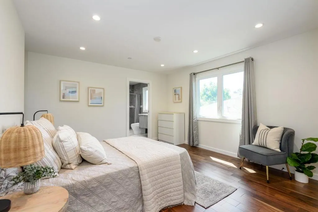Pristine elegance is the only way to describe this home! The Chef’s kitchen is the centerpiece, with Thermador appliances, a large LG refrigerator, and a 5 panel Centor glass door that fully opens to the backyard, creating seamless indoor-outdoor living. The 10-foot island, finished in elegant modern stone, provides seating for 4, generous storage, and a perfect gathering space. Fully renovated in 2022, this home has been transformed from a classic 1,700 sq. ft. layout into a bright, open modern residence with a 629 sq. t. expansion and soaring 14-ft ceilings in the kitchen and dining area. Enjoy solid hardwood floors and solid wood doors! Modern lighting, dual-pane windows, and fully owned solar panels. Smart features include central heating/air, fire sprinklers, and a recirculating hot water system.The home offers 3 suites, including 2 primary bedrooms with spa-style bathrooms finished in full tile and premium fixtures.High-end finishes! Outdoors, a lush pergola and an array of fruit trees including grape, plum, lime, tangerine, fig, and persimmon create a private garden oasis. A Tesla charger and modern laundry setup. A detached shed which can be used for whatever you see fit! This stunning home blends timeless quality with modern upgrades, move-in ready and built to impress.