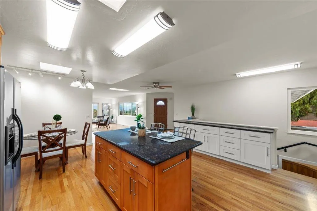 This gracious East Highlands home offers commanding views of the valley and San Jose Country Club golf course. Enjoy holiday fireworks from the front balcony or unwind by the midcentury fireplace. An updated kitchen featuring stainless appliances and handy island in the open concept living area makes entertaining easy! The lower level is ideal for those with mobility challenges or can be converted into a separate unit. Owned solar panels means no big utility bills during warm summer months when the central air conditioning is essential. You’ll feel you’re above it all, yet the home is just a few minutes from shopping and restaurants, plus it’s a quick 20-minute commute to downtown San Jose. Don’t miss this opportunity to become part of the East Foothills community – San Jose’s Best Kept Secret!
