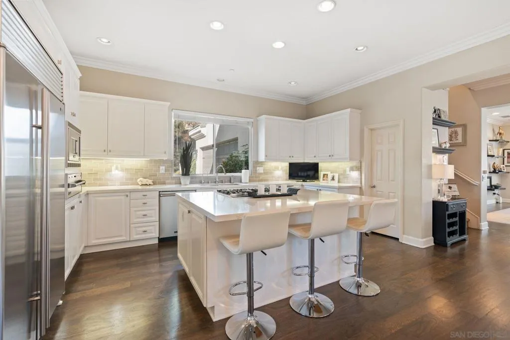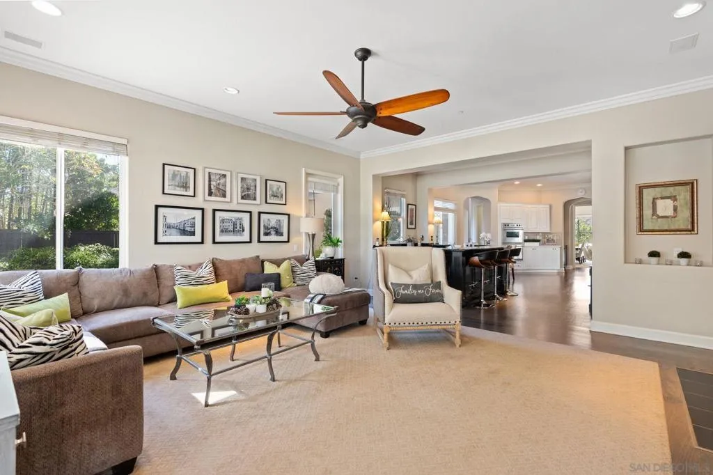 Welcome to 17117 Tallow Tree Lane — a wonderful home nestled within the exclusive, gated enclave of Savenna, one of San Diego’s most coveted communities in the prestigious 92127 zip code. This inviting residence spans over 5500 square feet and includes a fully permitted and detached guest house/casita, offering a total of six bedrooms and six-and-a-half bathrooms—each space thoughtfully presented to balance comfort, privacy, and comfortable living. Perfectly positioned on a private cul-de-sac and set on a half-acre of manicured grounds, this property embodies the elements of Southern California living. The resort-style backyard features a sparkling pool and spa, built-in barbecue pavilion, and multiple outdoor lounging and dining areas—creating an ideal setting for both intimate gatherings and grand entertaining. Inside, refined updates and timeless design harmonize. The gourmet chef’s kitchen showcases Viking appliances, white cabinetry, quartz countertops, double ovens, and designer fixtures, along with a convenient bar area with wine refrigerator and sink for effortless hosting. Throughout the home, new carpet, refreshed wood flooring, and an abundance of natural light accentuate its warm and welcoming ambiance. A first-floor ensuite bedroom offers comfort for guests, complemented by a dedicated office, hobby area, and music room—spaces perfectly suited for creativity, productivity, or peaceful retreat. Upstairs, the main suite is a true sanctuary, featuring a fireplace, dual walk-in closets, a personal fitness room, and a newly remodeled spa-inspired bathroom. Three additional bedrooms—each with its own ensuite bath—ensure privacy and ease for family or guests. Additional living spaces include a tranquil library, an elegant formal dining room, and a spacious living room designed for gathering and connection. Modern convenience and sustainability are seamlessly integrated, with Tesla solar panels, two 75-gallon water heaters, a whole-home water softener, and an epoxy-coated four-car garage. The guest house extends the estate’s versatility with 441 square feet of private living space, a full bath, cooktop, and wood and tile flooring—perfect for extended family, visitors, or potential income use. Impeccably maintained and thoughtfully designed, this home offers a lifestyle defined by serenity, versatility, and style.
