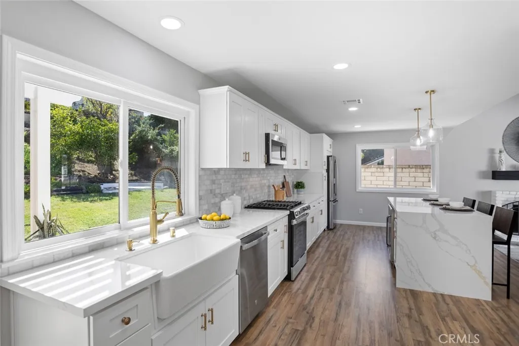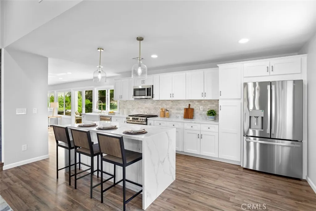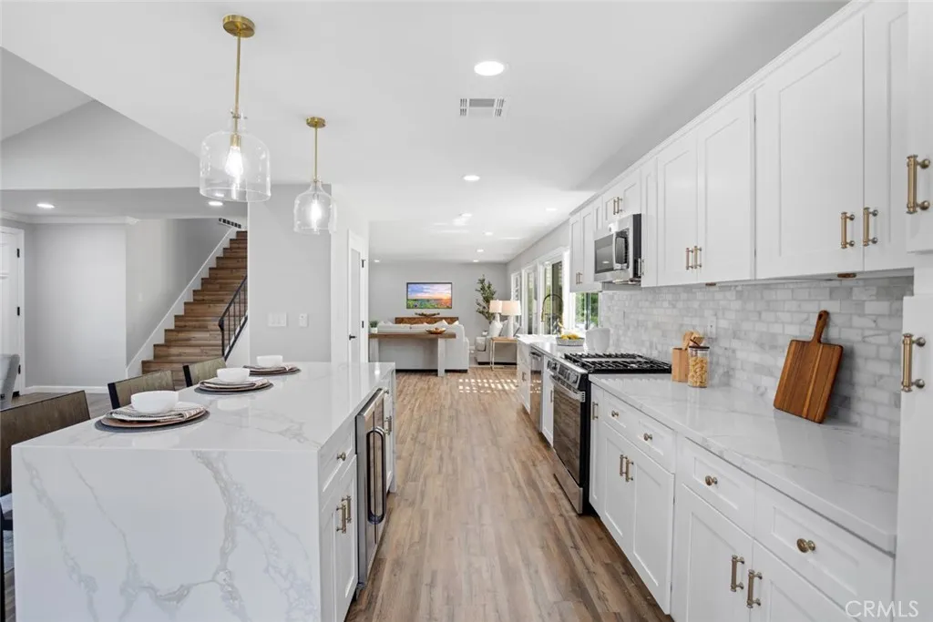 DON’T MISS OUT on this recently updated and spacious TURNKEY home located in a quiet cul-de-sac in one of the most coveted neighborhoods of La Habra! To start off, this home boasts 4 bedrooms and 3 bathrooms including a large master suite with its own luxurious master bathroom and walk-in closet! Throughout the home you’ll find LED recess lighting, premium water-proof laminate flooring, a stunning open-concept kitchen containing high-end quartz countertops, a center island with a waterfall finish, a farmhouse sink overlooking the backyard and white shaker cabinets with self-closing drawers! Also, along with the remodeled kitchen there will be a full high-end stainless steel appliance package and wine fridge included! Then, there is a wet bar containing high-end quartz countertops, a sink and white shaker cabinets right next to the cozy living area making the entire space perfect for entertaining days/nights! For the exterior, the front yard contains an attractive curb appeal and a walkway that leads to the inviting front entry while the spacious backyard contains a patio area and freshly laid sod making the entire yard a great space for future family gatherings! In addition, this home offers high efficiency dual-pane vinyl windows throughout and central air/heating! To top it all off, this home is conveniently located within walking distance of multiple shopping centers, such as the Imperial Promenade and the La Habra Market Place, and within minutes of the Westridge Golf Club, Brea Mall and Downtown Brea which both contain beloved restaurants, shops, entertainment and more!