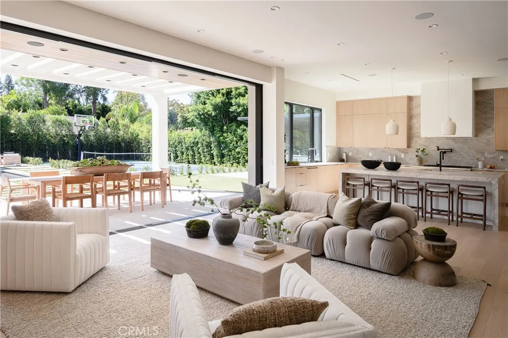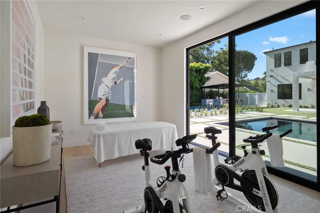 The property also includes an 830-square-foot single-story guest house that features a full kitchen, a laundry area, and a spacious private bedroom. Outdoor highlights consist of a 219-square-foot enclosed separate & private gym, a sports court, a pickleball court, and a covered outdoor barbecue area, all set within the expansive entertainer’s backyard.