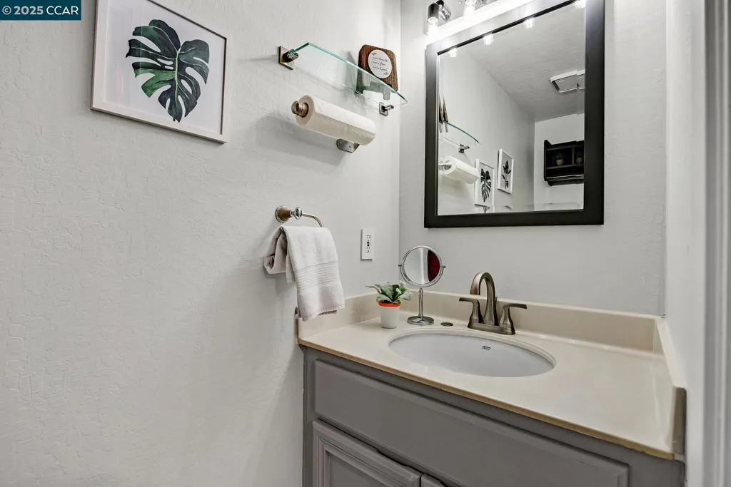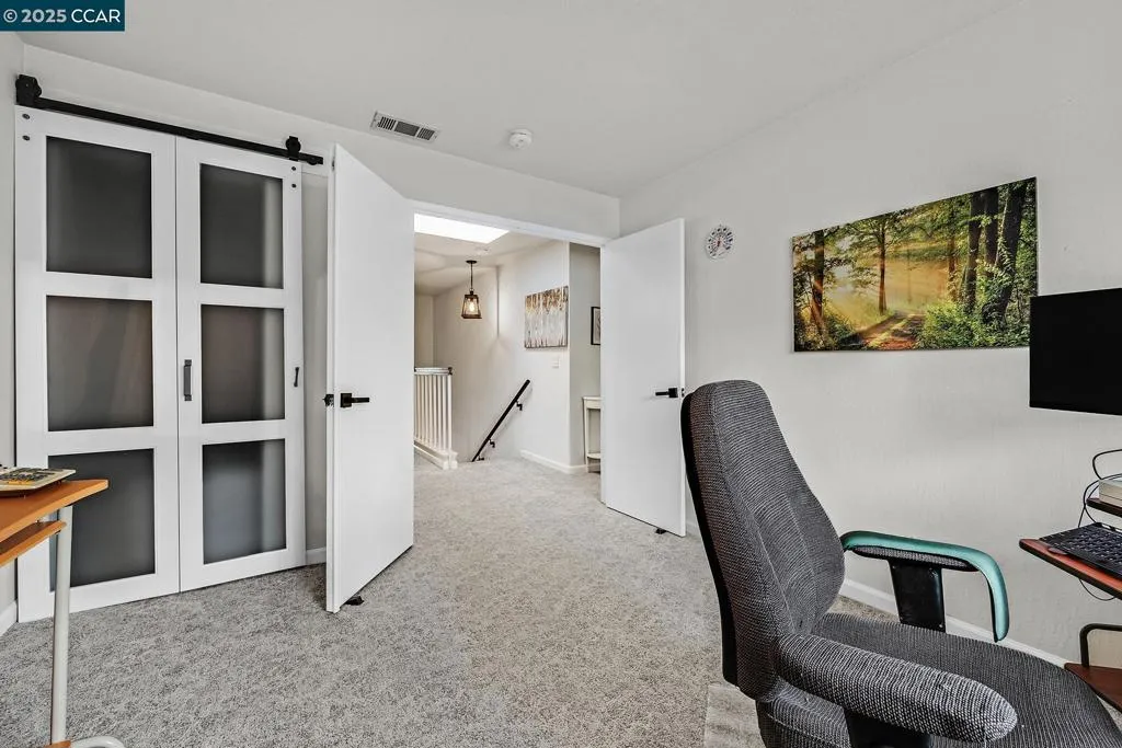 With a serene setting overlooking ponds and fountains, lush landscaping, scenic walking paths, and picturesque walking bridges over ponds, this rarely available three bedroom, two and one-half bath, approximately 1,371 square foot end unit with fireplace in the living room, has an attached two-car garage and has been tastefully updated with quartz countertops in the kitchen, SS appliances, luxury vinyl plank flooring, plush carpeting upstairs and Frosted Glass Bi-fold Barn Doors in the primary suite and office and much more! Enjoy the patio and balcony overlooking the resort-style grounds, offering a peaceful retreat with the pool just steps away. Tranquil setting yet conveniently located.