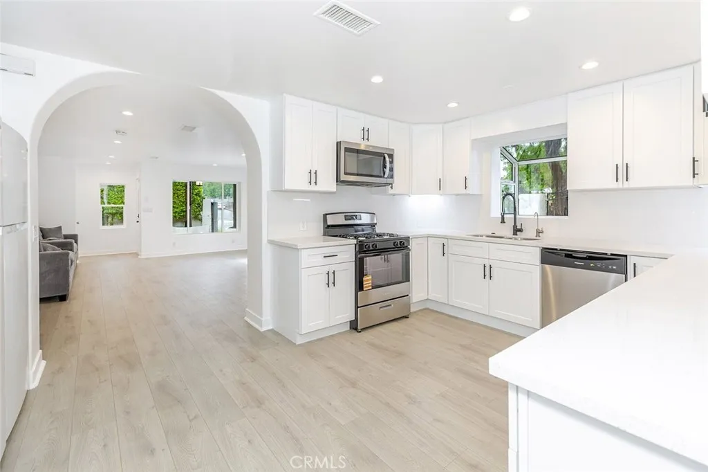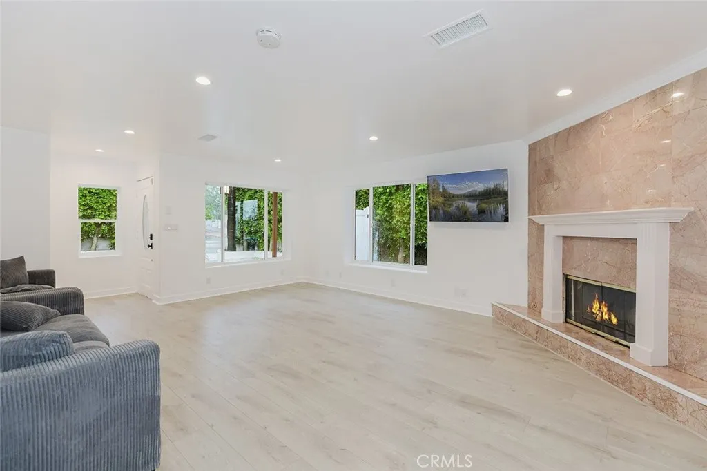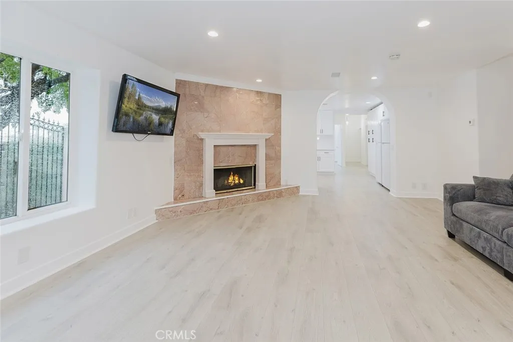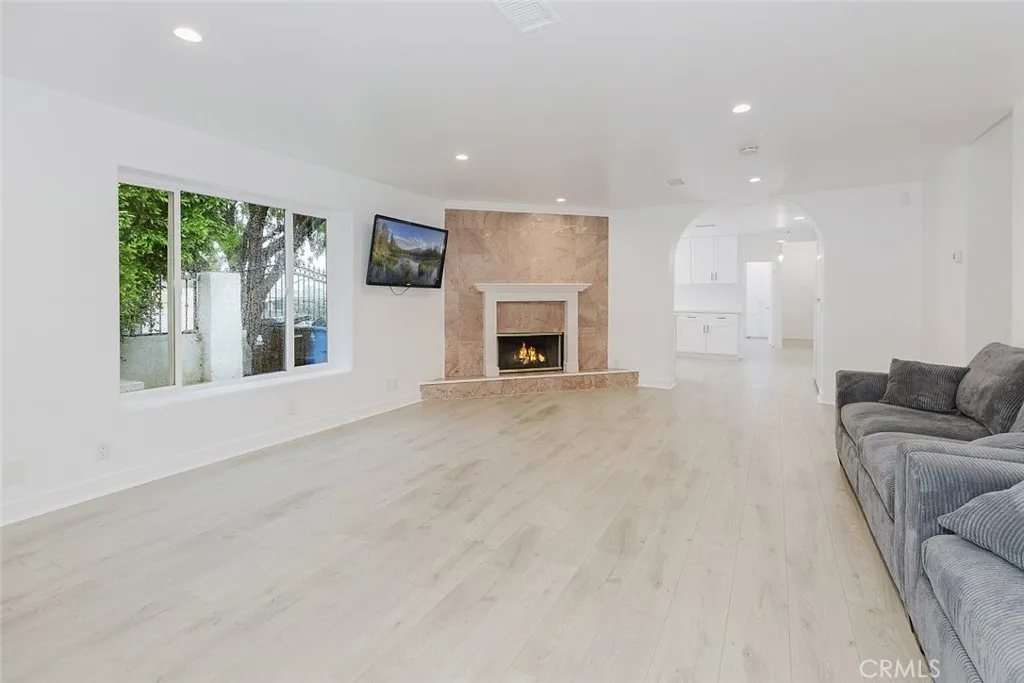 Once inside you’ll discover a fully renovated interior featuring new laminate flooring, a modern kitchen with quartz countertops, ample cabinetry, and brand-new stainless steel appliances, including a stove, dishwasher, microwave, two refrigerators, and a stackable washer/dryer, all included in the sale. The home has been freshly painted throughout and showcases an open-concept layout with spacious, light-filled rooms, recessed lighting, and a gas fireplace with a stylish tile backdrop.