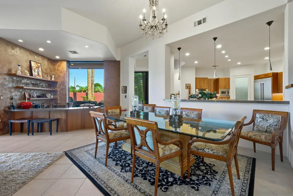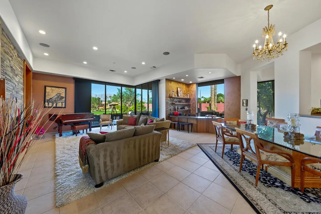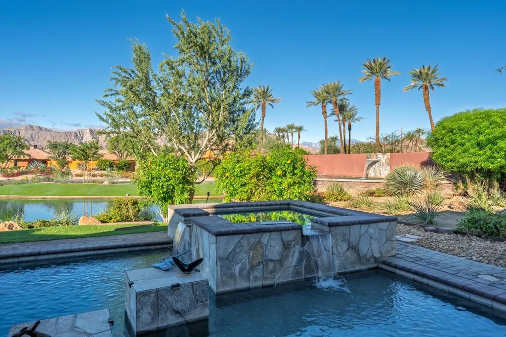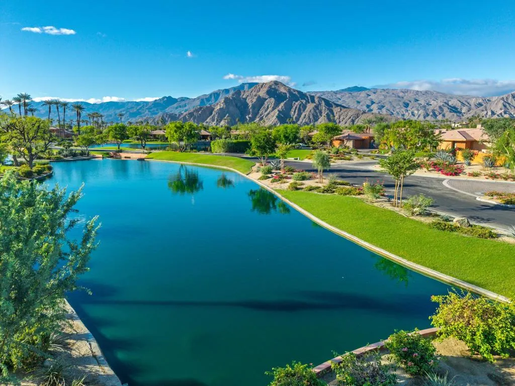 Lakefront Luxury with Panoramic Mountain Views in Palmilla.This stunning Palo Brea model home offers one of the most spectacular, unobstructed southwest-facing views of the Santa Rosa Mountains in Palmilla–with no homes across the lake for exceptional privacy. Spanning 3,278 square feet, this residence showcases refined upgrades and seamless indoor-outdoor living.The open-concept kitchen, dining, and living areas are framed by walls of floor-to-ceiling sliding glass doors that expand to the patio, pool, and shimmering lake beyond, completely erasing the boundary between indoors and out and creating a true indoor/outdoor living experience. Custom cabinetry enhances the living room, kitchen, and closets, while a stone-accent fireplace, wet bar, and designer fixtures elevate the home’s sophistication.Two spacious primary bedroom suites provide luxurious comfort, and a flexible third bedroom–currently used as an office–opens to a serene private courtyard patio. From the primary suite, take in awe-inspiring panoramas of the mountains and lake, redefining luxury desert living. Outdoors, enjoy resort-style amenities including a built-in barbecue island, large pool and spa with a water feature, citrus trees, and professional landscape lighting.Additional highlights include high-end appliances, custom window treatments, a 2-car plus golf cart garage, and meticulously selected hardware throughout.Architecturally acclaimed Palmilla is an exclusive, 24-hour guard-gated community featuring just 152 single-family homes. This enclave showcases an eye-catching blend of modern and craftsman-style architecture, thoughtfully designed to harmonize with its stunning natural surroundings.Nestled among shimmering lakes and custom-crafted metal artwork, Palmilla offers residents a serene and artful environment. The community enjoys direct, private golf cart access to The Citrus Golf Club–one of the area’s premier courses–providing effortless opportunities to enjoy world-class golfing just moments from home.