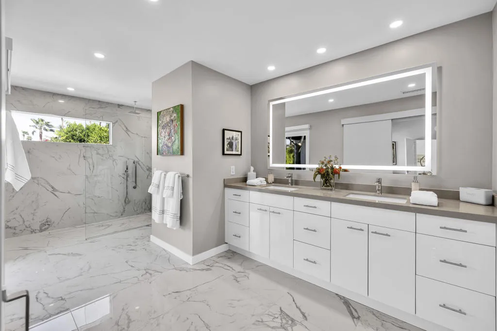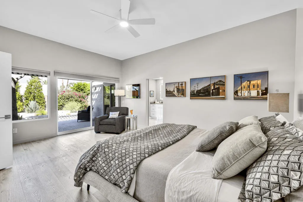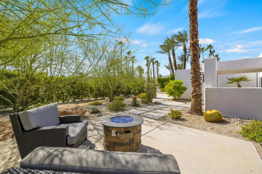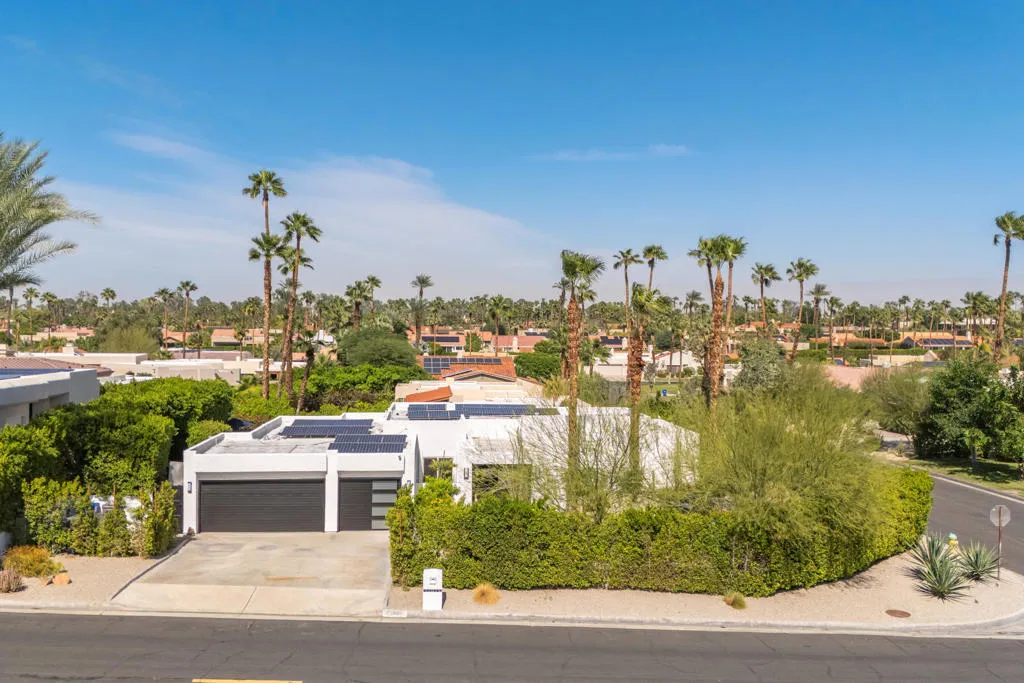 Designed for effortless and sustainable desert living, this recently updated Rancho Mirage home blends elegance, comfort, and privacy on an 11,326 sq/ft corner lot in the very sought-after Tamarisk area. Energy-efficient upgrades include OWNED Solar with a Tesla battery and a 240v EV electric outlet, dual-pane windows and doors, two-zone HVAC with smart thermostats, tankless water heater, whole-house reverse osmosis system, and water softener. The layout emphasizes high ceilings in the living area and primary suite, creating a light-filled, open feel. A three-sided fireplace anchors the main living spaces, while quartz countertops and smooth-coated walls and ceilings bring a modern touch throughout. Both bedrooms are en-suite, while the den provides flexible space for work or an additional sleeping area. Out back, a covered patio, pool, and spa are surrounded by mature landscaping that enhances the sense of seclusion. This large corner lot allows additional leisure space in the front yard shaded by mature Palo Verde and Eucalyptus trees and shielded by a Ficus hedge. A rare 3-car garage with new epoxy floors completes this well-appointed residence. With no HOA or land lease this calm retreat combines convenience, efficiency, and the relaxed lifestyle of Rancho Mirage’s Tamarisk neighborhood.