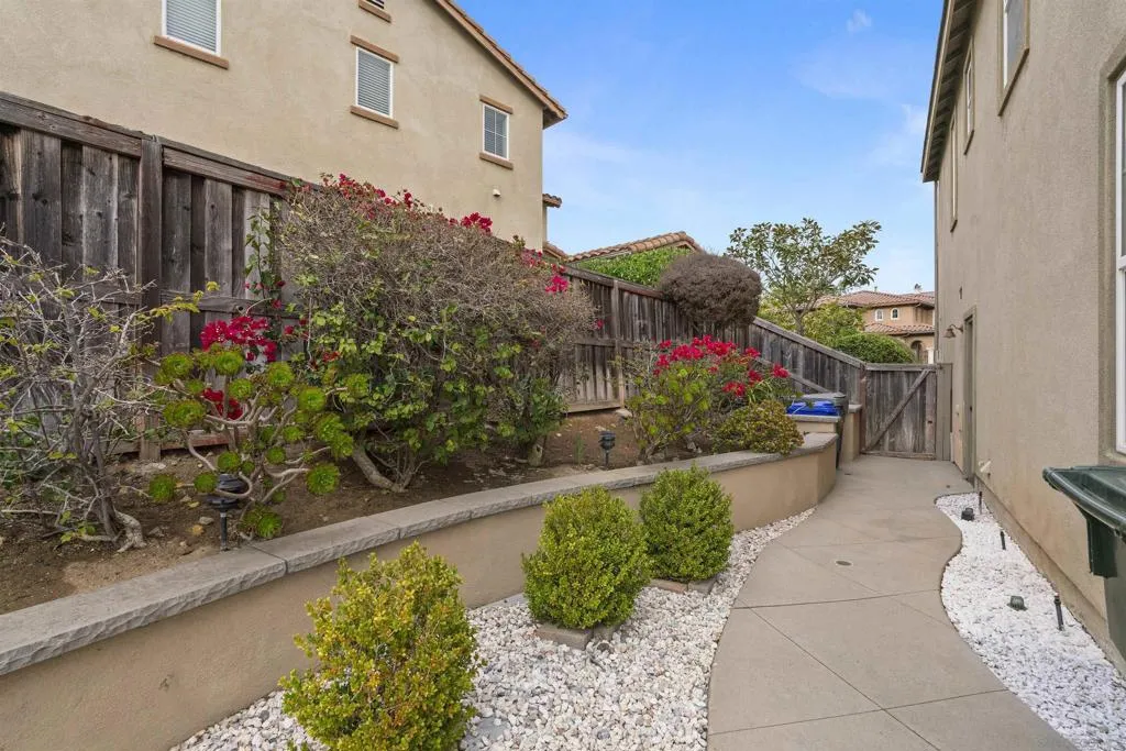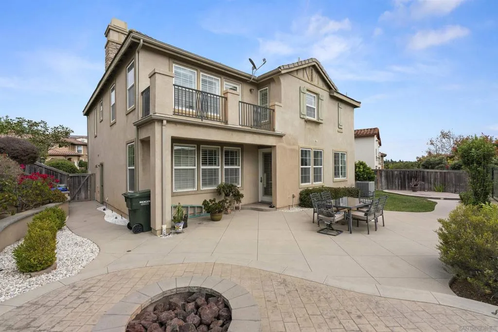 Meticulously maintained home in desirable Luminara of San Elijo Hills. Gorgeous curbside appeal with handsome stone finishes and lush mature landscaping. Front pathway leads to shaded courtyard with majestic trees and garden. The backyard is adorned with custom pavers and hardscape, a built-in fireplace, and a low maintenance yard with plenty of space for outdoor seating. Home is beaming with natural light, featuring arched doorways, wood floors, limestone flooring in kitchen and primary en-suite, granite counters & backsplash, staineless steel appliances, downstairs powder room and modern shutters throughout. Spacious loft upstairs can serve as an optional 4th bedroom, office, or den. Soak in the gorgeous hillside views from the primary suite balcony. Spacious en-suite offers double sinks, large soaking tub, separate shower, walk-in closet and lots of storage. All bedrooms and laundry located upstairs. Built-in refrigerator, washer and dryer are included with the sale. The San Elijo Hills community is sought after for its top-rated schools, quaint town center that includes a magnificent public park equipped with a stage and seating for community events, rows of shops and restaurants, and is just minutes to pristine San Diego beaches. BE SURE TO VIEW THE VIDEO TOUR TO CAPTURE THE BEAUTY OF THIS HOME!