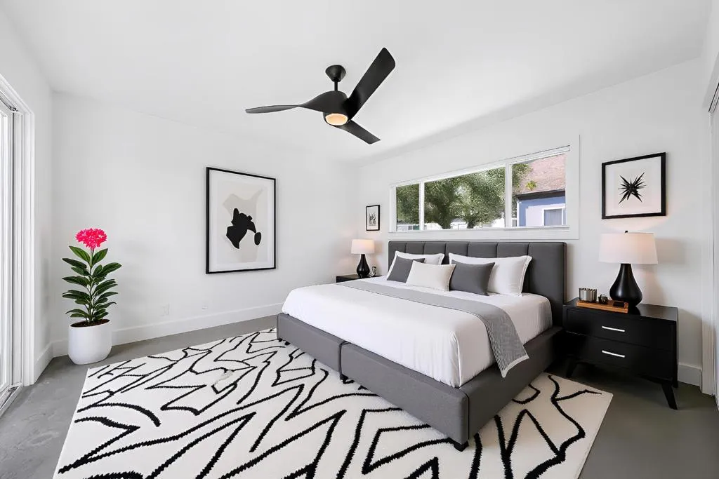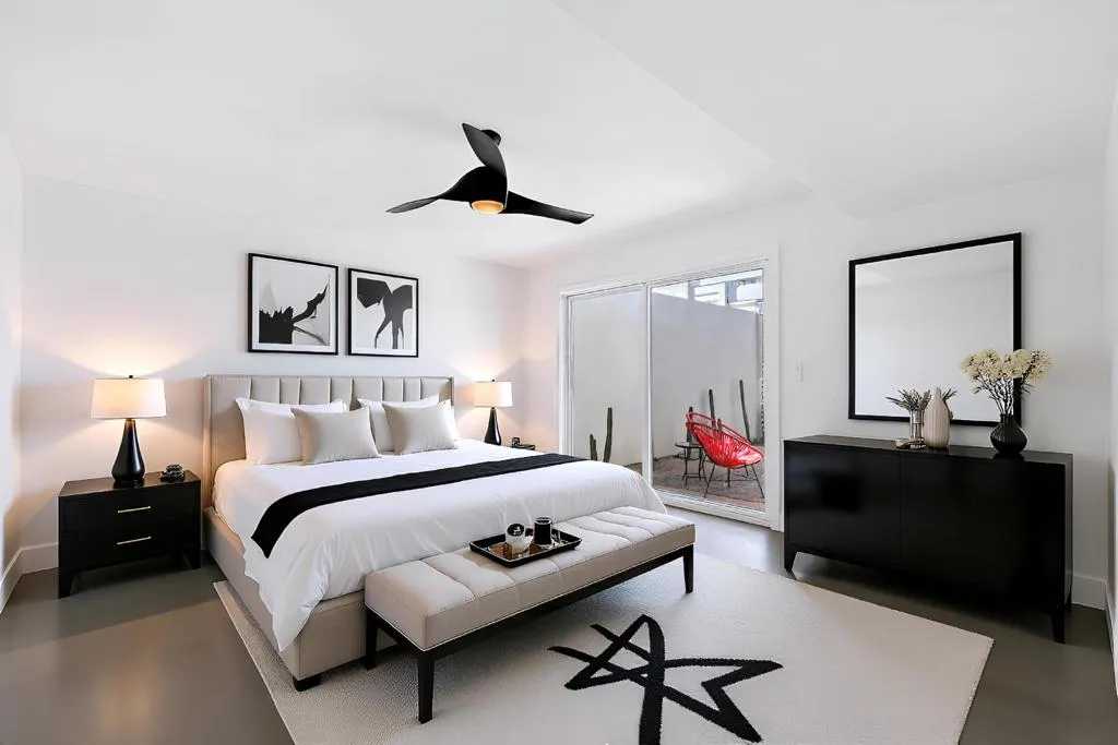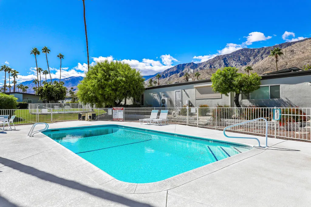 Welcome to Palo Fierro Estates, a 1966 mid-century modern gem that perfectly captures the vibrant, timeless Palm Springs lifestyle – on FEE land! This well thought out floor plan has two bedrooms and two bathrooms that are nicely separated by a beautiful private patio. Sliding doors on three sides create refreshing indoor/outdoor living, perfect for entertaining or simply allowing that fresh seasonal air in! A freestanding mid-mod fireplace steals the spotlight in the living area, surrounded by beamed ceilings and abundant natural light. The galley kitchen, with generous storage, has new counters and fully operational vintage ovens. The owner has also replaced all the windows and sliders, installed a new dishwasher, new washer and dryer, new interior doors, updated tile, faucets and mirrors in the bathrooms and more! With the updates, fresh paint and refinished concrete floors, this home is ready to come to life! Additionally, just steps outside the back door are two sparkling pools waiting for your enjoyment. This South Palm Springs neighborhood is moments away from golfing, hiking trails, shopping and dining…truly a special location that offers both tranquility and easy access to Palm Springs’ vibrant scene! Welcome home!
