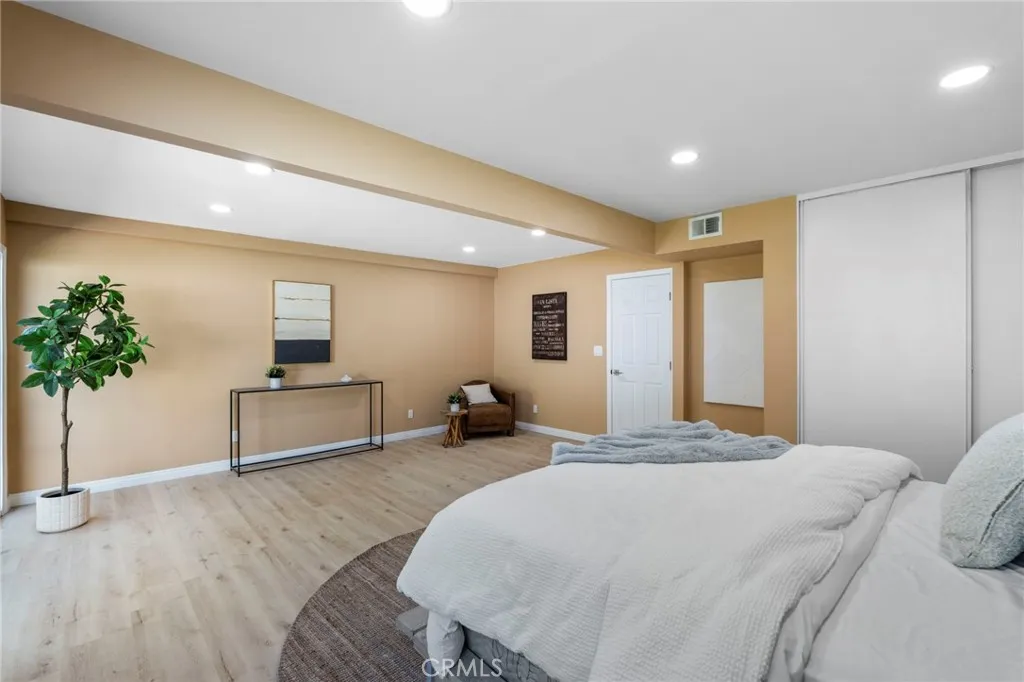 Discover this beautifully remodeled tri-level home in sought-after Granada Hills, offering the perfect blend of modern elegance and family comfort. Boasting 5 spacious bedrooms and 3 updated bathrooms across 2,769 square feet, this residence sits on an expansive nearly 7,500 square foot lot. The inviting living room welcomes you with soaring vaulted ceilings, wood-style flooring throughout, and a charming wood-burning fireplace, seamlessly flowing to a formal dining area highlighted by a custom chandelier—ideal for hosting memorable gatherings. The contemporary kitchen is a chef’s dream, featuring crisp white cabinetry, quartz-style countertops, stainless steel appliances, and a sunlit breakfast nook overlooking the backyard. Upstairs, the luxurious primary suite showcases a remodeled en-suite bath with high-end finishes, modern fixtures, and a walk-in closet, while additional bedrooms and a remodeled hall bath offer flexibility for family, guests, or a home office. Downstairs, an extra-large bedroom with an adjacent full bath is perfectly suited for guests or multi-generational living. Step outside to a private backyard oasis with a spacious tiled patio, wood cover, mature fruit trees, and ample room for entertaining, gardening, or relaxation. Completing this ideal package is a three-car garage with abundant storage, plus easy access to shopping, dining, and transportation. Experience modern comfort, space, and style—make this move-in ready home yours today!