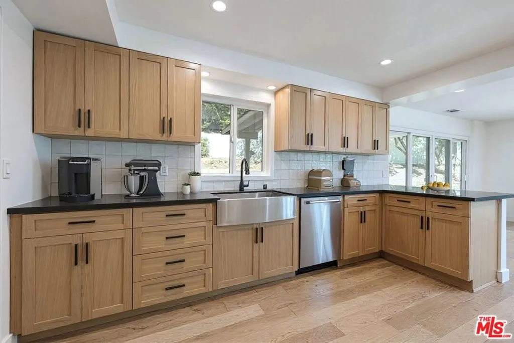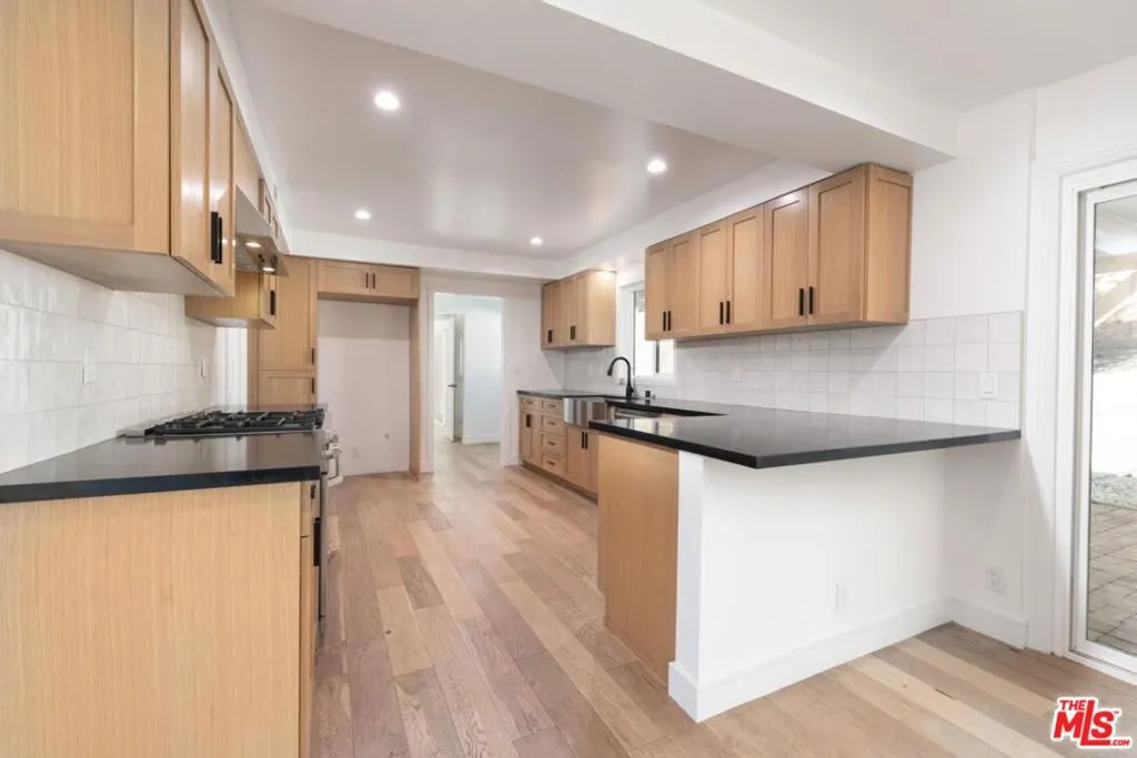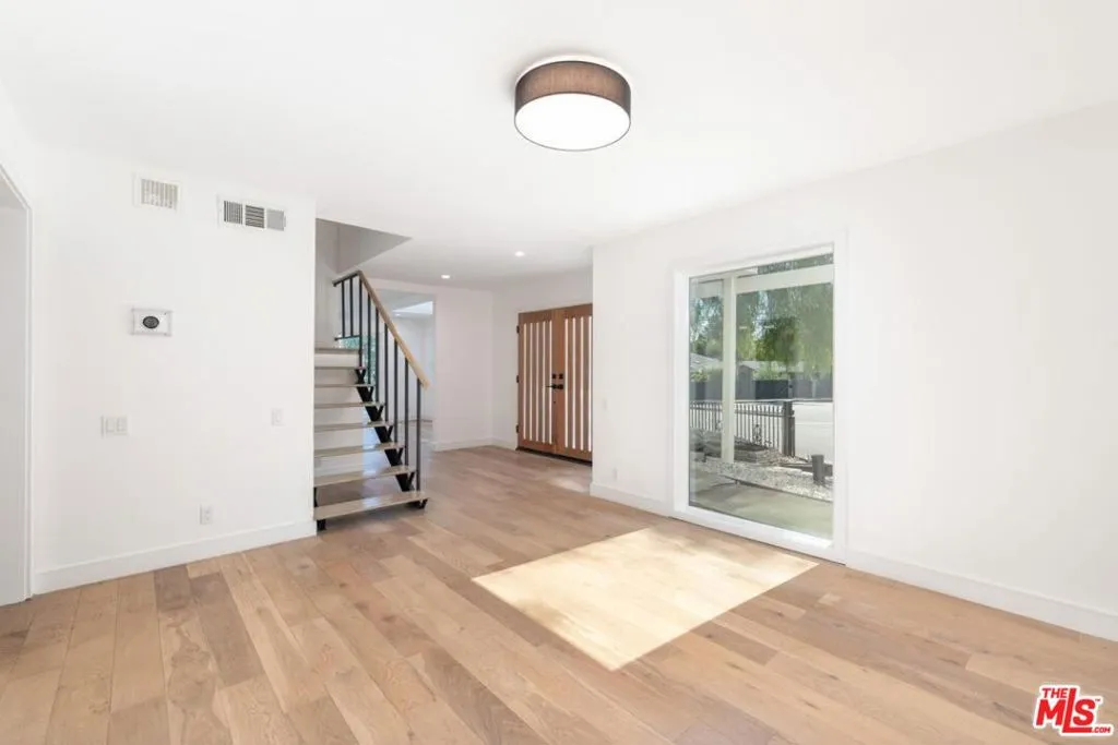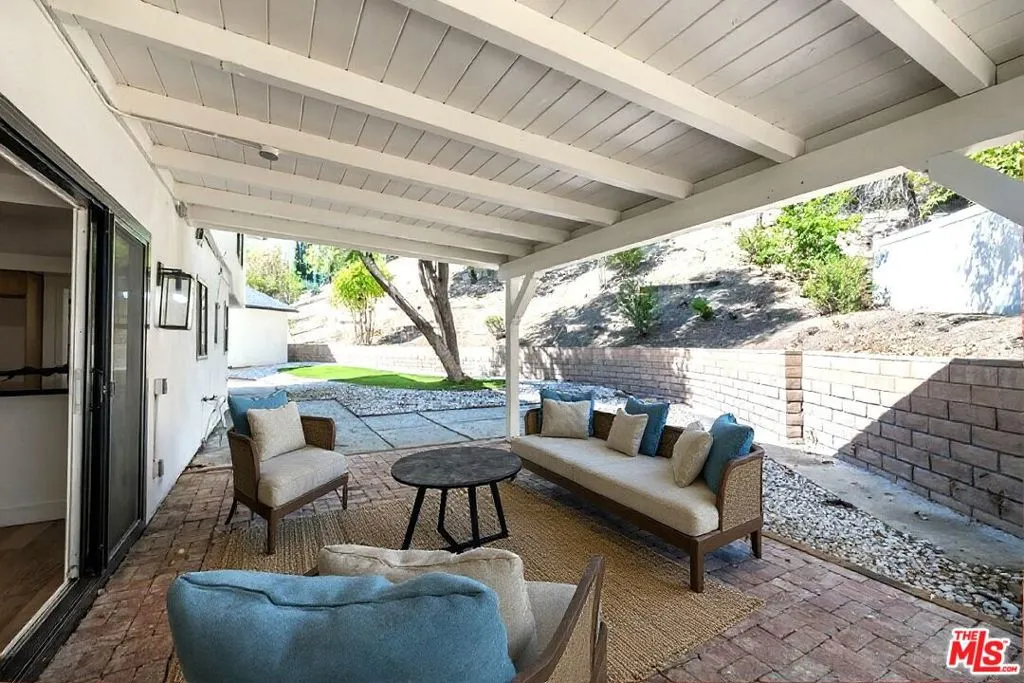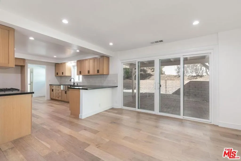Contemporary home located in the lovely Walnut Acres neighborhood of Woodland Hills. The gated home sits on a 17,345 sq ft lot high above the street. A long private driveway accesses a detached 2-car garage. Entryway into the home is through a decorative double door that swings wide to expose an interior flooded with natural light from the large windows, sliding glass doors and skylights. A very spacious living room with access to the backyard is perfect for quiet relaxation or entertaining friends. The kitchen is completely updated and modernized with cabinets, quartz countertops and Bertazzoni stainless steel appliances. The dining area adjacent to the kitchen has sliding glass doors leading to a covered brick patio ideal for dining alfresco. The den area also features outdoor access through sliding glass doors. The 4 bedrooms are located upstairs. The primary suite is extra-large with a spacious double closet and remodeled bathroom with dual sinks. Wood floors throughout this home add to the modern appeal. Conveniently located in close proximity to the Warner Center, The Village, dining and shopping areas.