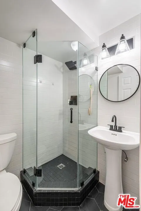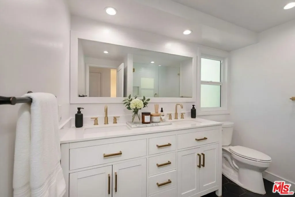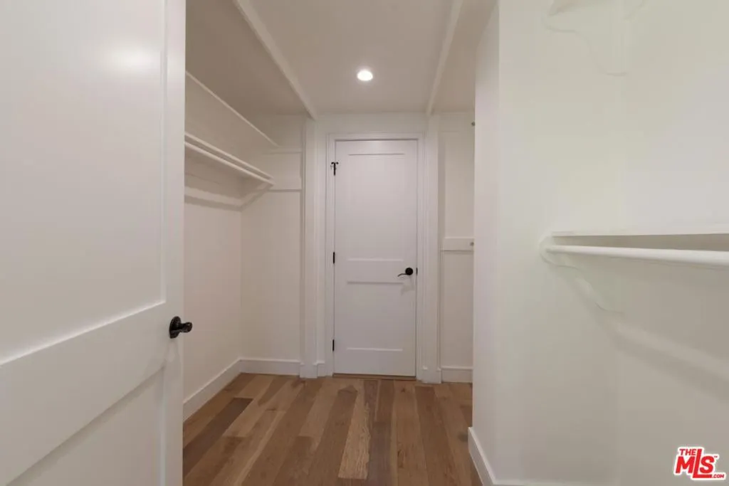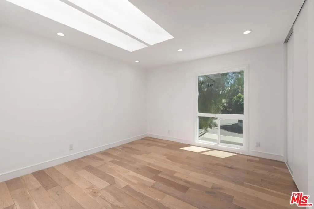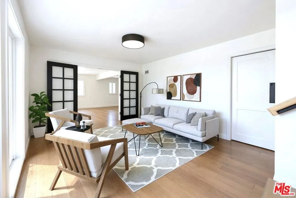 Contemporary home located in the lovely Walnut Acres neighborhood of Woodland Hills. The gated home sits on a 17,345 sq ft lot high above the street. A long private driveway accesses a detached 2-car garage. Entryway into the home is through a decorative double door that swings wide to expose an interior flooded with natural light from the large windows, sliding glass doors and skylights. A very spacious living room with access to the backyard is perfect for quiet relaxation or entertaining friends. The kitchen is completely updated and modernized with cabinets, quartz countertops and Bertazzoni stainless steel appliances. The dining area adjacent to the kitchen has sliding glass doors leading to a covered brick patio ideal for dining alfresco. The den area also features outdoor access through sliding glass doors. The 4 bedrooms are located upstairs. The primary suite is extra-large with a spacious double closet and remodeled bathroom with dual sinks. Wood floors throughout this home add to the modern appeal. Conveniently located in close proximity to the Warner Center, The Village, dining and shopping areas.