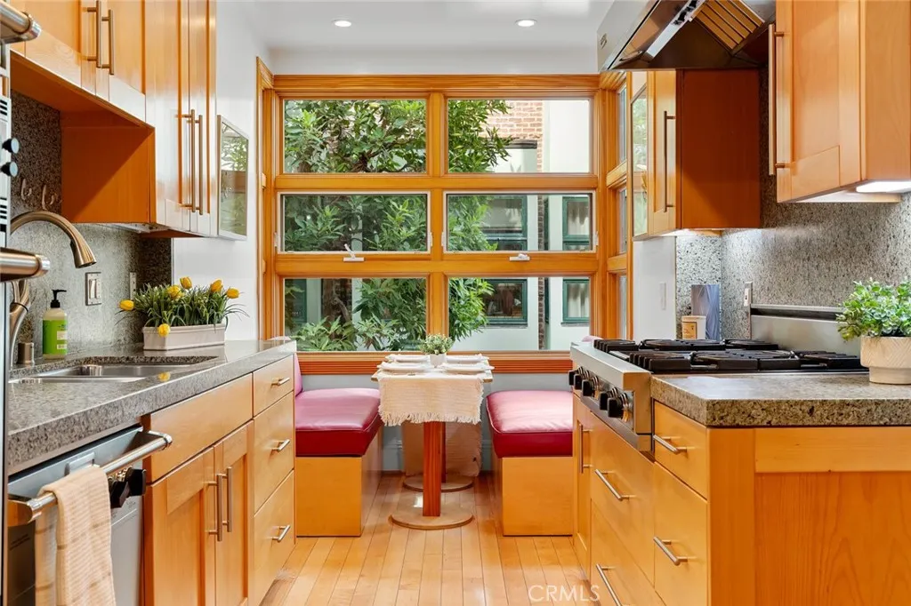The main floor showcases a spacious open-concept living area filled with natural light, featuring a cozy fireplace, a built-in bar with wine fridge, and access to a gated front patio—perfect for entertaining. The gourmet kitchen boasts wood cabinetry, granite countertops and backsplash, Viking stainless-steel appliances, an LG microwave, and a charming built-in breakfast nook. A powder room completes this level.