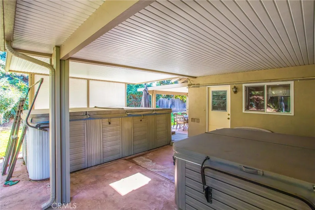 Outside there is a wrap around patio which has a standard spa and a swim spa that is great for daily exercising. As the patio wraps to the back there is plenty of room for outdoor entertaining with a picnic table and seating areas. This area is overlooked from the living room and through the sliding French doors. The yard is totally private and there is plenty of room for a pool. It also features an outdoor storage shed for gardening tools.