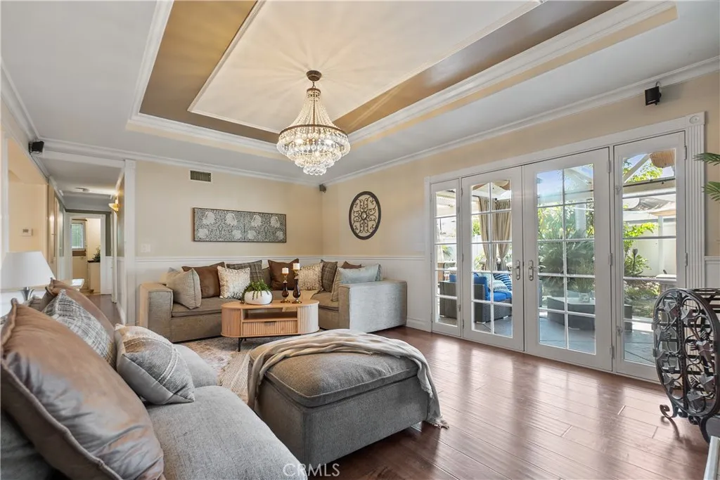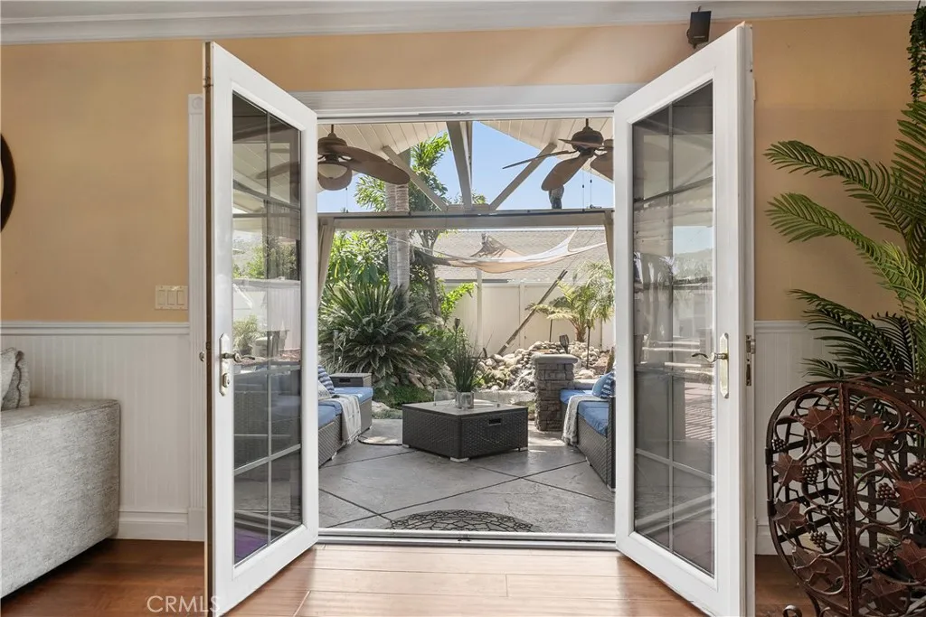 Elegant custom molding throughout. Spacious living room with decorative fireplace and French doors to the backyard. The dining area features built-in bench seating perfect for family meals. Completely remodeled kitchen with white cabinetry, stone countertops, stainless steel appliances, modern lighting, and a huge walk-in pantry