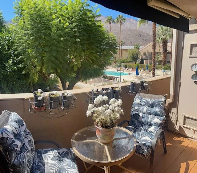 Popular complex in the heart of the downtown area of Palm Springs, offered for a year’s lease, furnished or unfurnished. Upper unit with great pool and mountain views, washer and dryer in unit.
