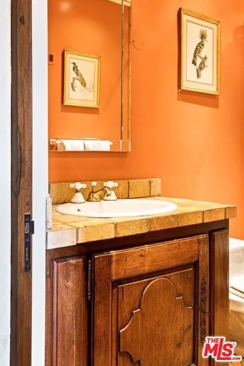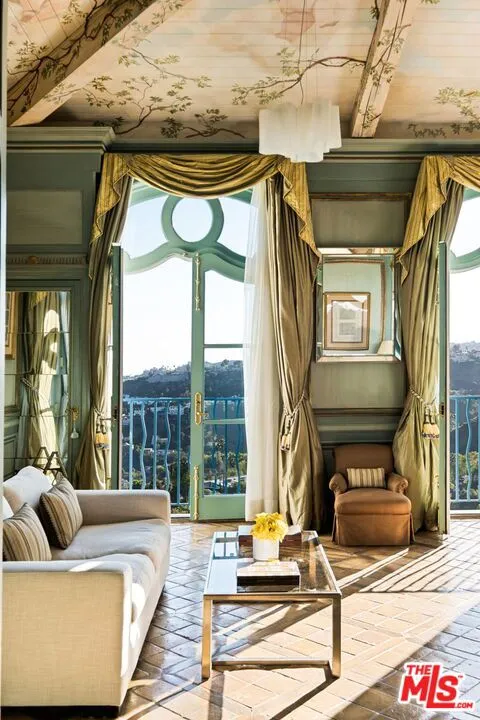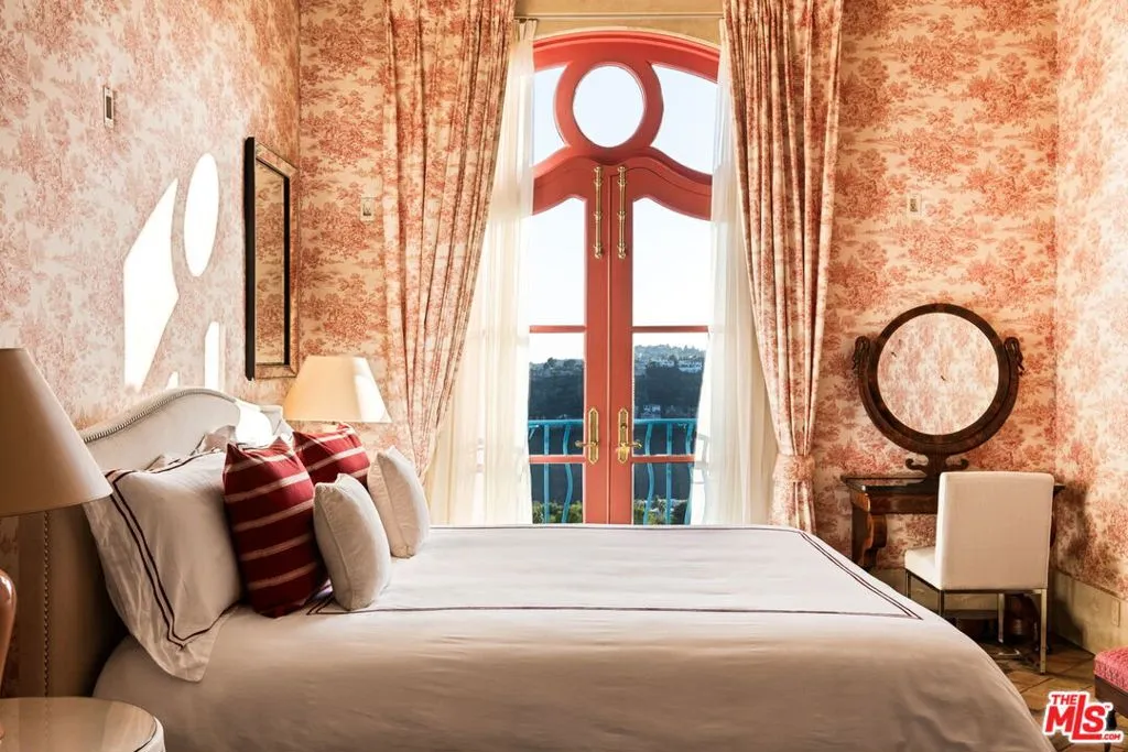 Step into the romance of the French countryside right in the heart of the Hollywood Hills. This fully furnished French Renaissance inspired chateau, perched high above Mulholland Drive, offers sweeping city, canyon, and ocean views that define California luxury. Cloaked in ivy, the residence’s facade evokes centuries of history, adorned with authentic 15th-century hand-carved stone angels and gargoyles imported from France. Beyond the grand entrance, time seems to stand still. Inside, exquisite craftsmanship and timeless elegance abound. A stately 16th-century marble staircase ascends to the upper level, where three sumptuous bedrooms await. The grand primary suite serves as a true sanctuary, complete with an en-suite salon featuring a painted and gilded boiserie masterpiece. A fourth guest suite, with a private entrance, lies downstairs. Designed for effortless entertaining and refined living, the home seamlessly blends indoor and outdoor spaces. French doors flood the interiors with natural light, while the painted stone walls and graceful architectural details exude old-world charm. Expansive terraces provide inviting spaces for lounging or al fresco dining, all framed by panoramic vistas that stretch from the canyon to the glittering skyline and out to the ocean beyond.