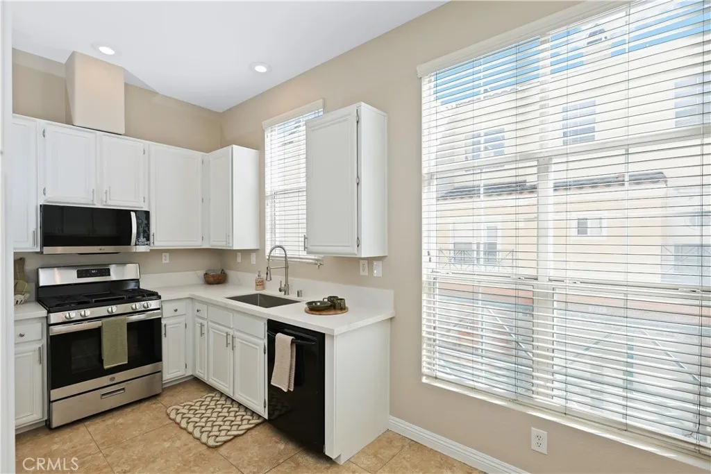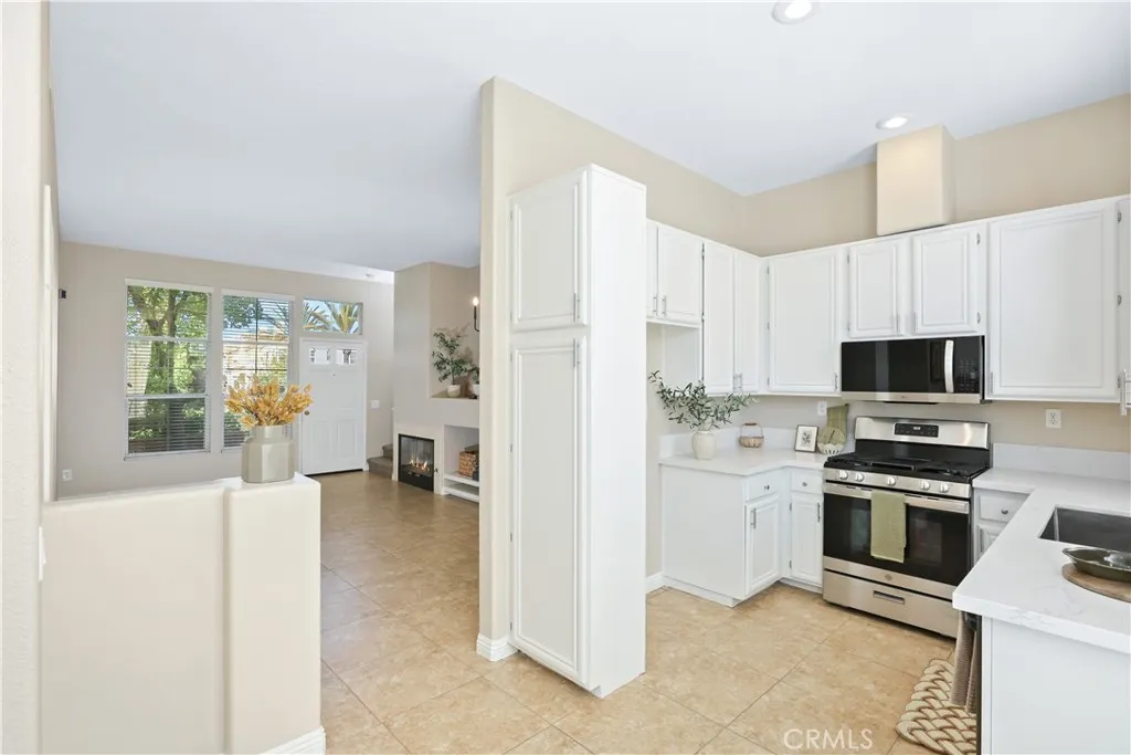 The heart of the home is the beautifully remodeled kitchen, showcasing bright white cabinetry with/ new hardware, quartz countertops, a brand-new stove, new microwave & a new stainless steel farmhouse sink & faucet. Directly across from the kitchen, a remodeled built-in desk/workstation provides the ideal setup for working from home or everyday organization.