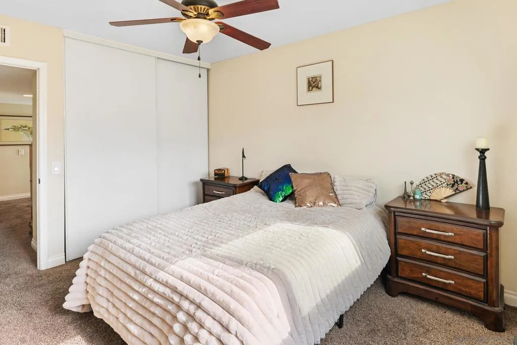 Highly coveted end-unit in Vista Del Cerro! Spacious living room with soaring ceilings, gas fireplace, and access to a private patio. Gourmet kitchen with granite counters, stainless steel appliances, and breakfast bar. Upstairs features a primary suite with tall ceilings, ample closets, and a private balcony, plus two additional bedrooms. Gated front patio and attached two-car garage. Community offers park-like grounds, pool, and clubhouse. Walk to highly rated Dailard Elementary and Patrick Henry High School. A true must-see!