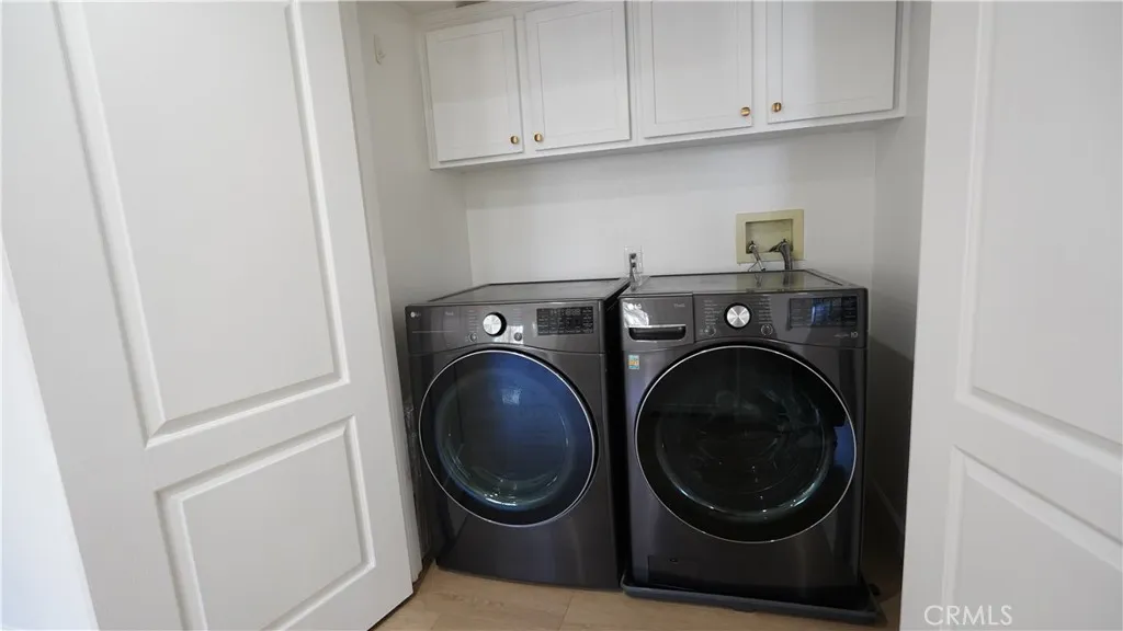 Included are a refrigerator and washer, and the home features hardwood flooring throughout with no carpet. The kitchen and bathrooms are equipped with custom cabinetry, stainless steel appliances creating an elegant and modern ambiance.