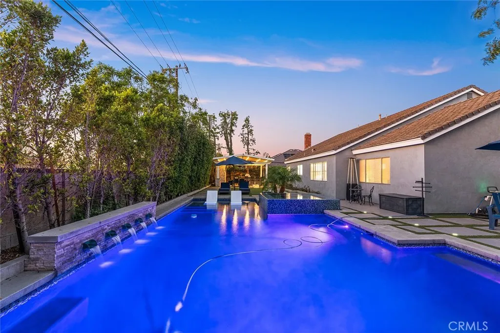The backyard is designed for year-round enjoyment—featuring a pool and spa with LED color-changing lights, a gas-plumbed fireplace and built-in outdoor kitchen, and a covered cabana for shaded relaxation. Whether you are hosting friends or winding down on a quiet evening, this space delivers the best of Southern California living. There’s even a side yard with room for a dog run.