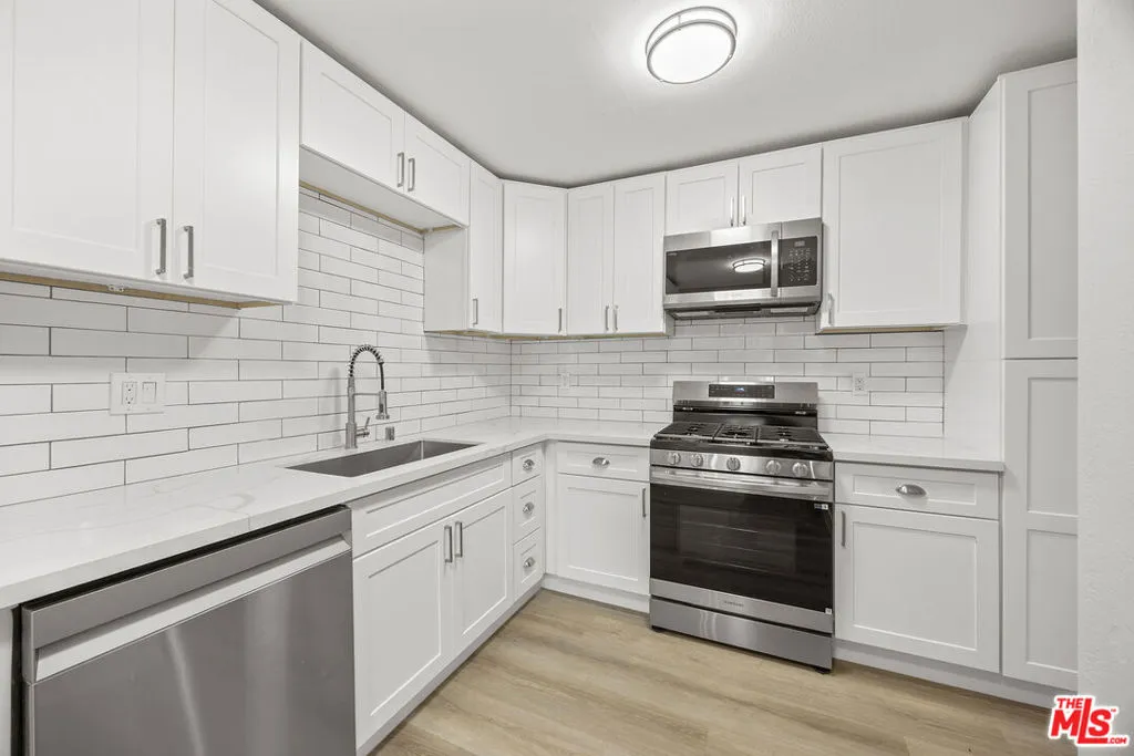 Completely remodeled end unit condo in a peaceful pocket of Van Nuys. This 2 bedroom 1 3/4 bathroom unit offers plenty of natural light and has new luxury vinyl flooring, new paint, new windows, new bathrooms and kitchen. Lots of storage space inside unit. Ample size balcony. New HVAC system. Two underground parking space. Unit located at the end of building facing Ranchito Ave and located on the quieter side of Sherman Way. Conveniently located walking distance to grocery stores, shopping centers and restaurants.