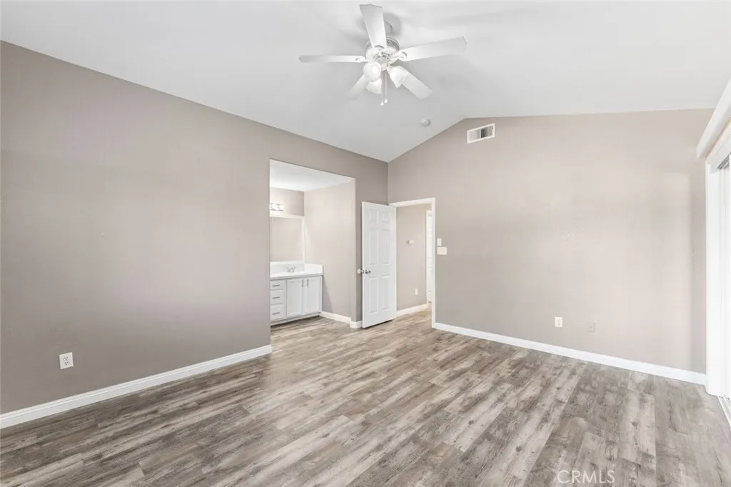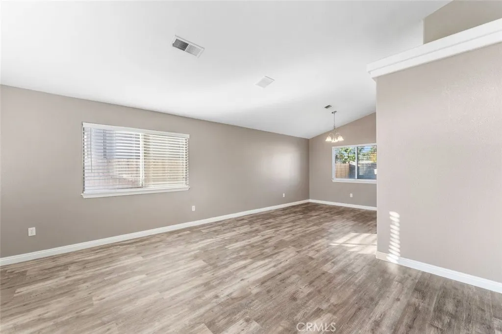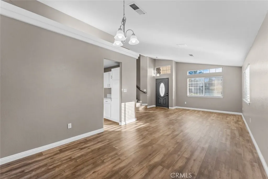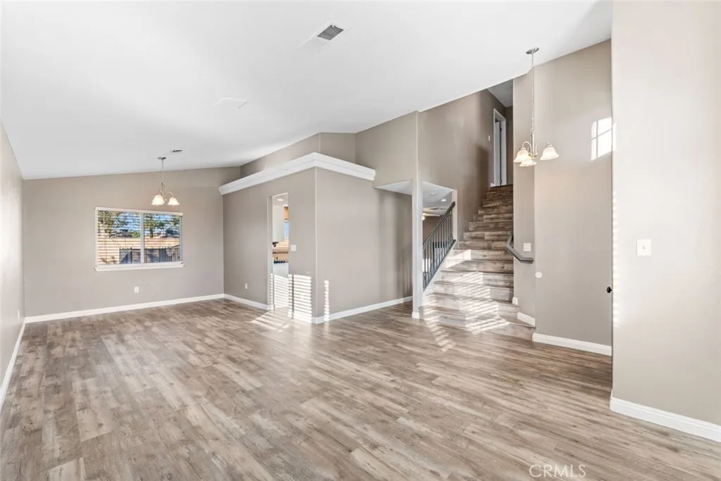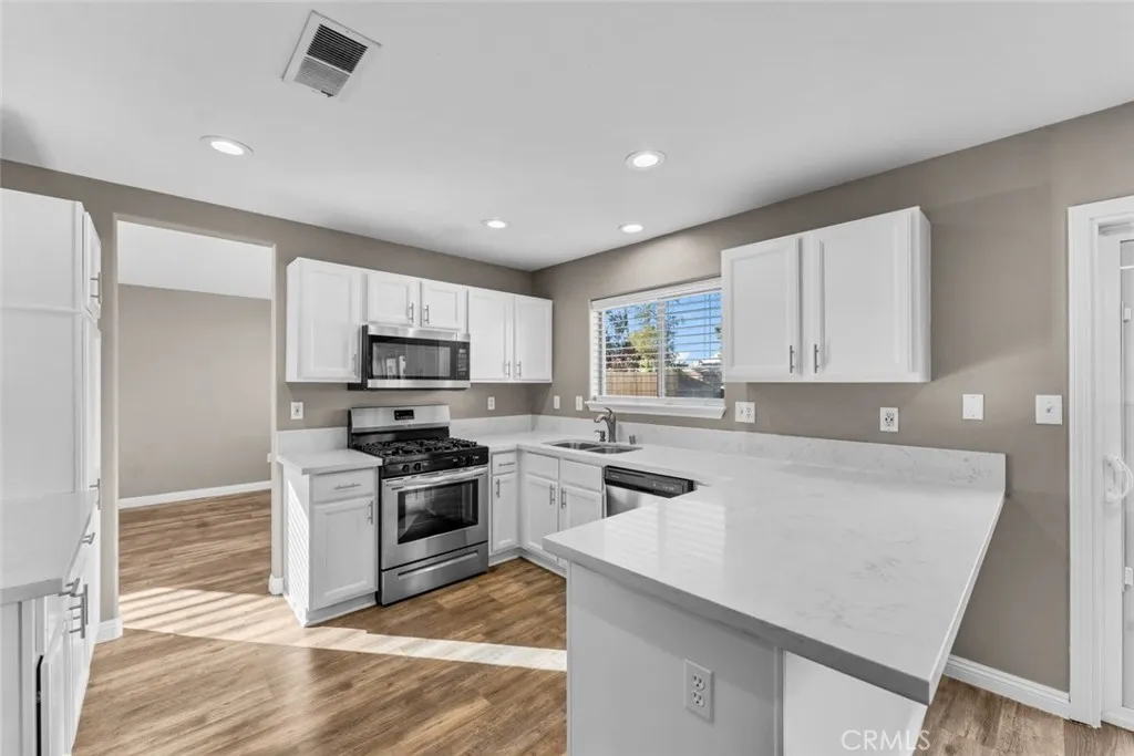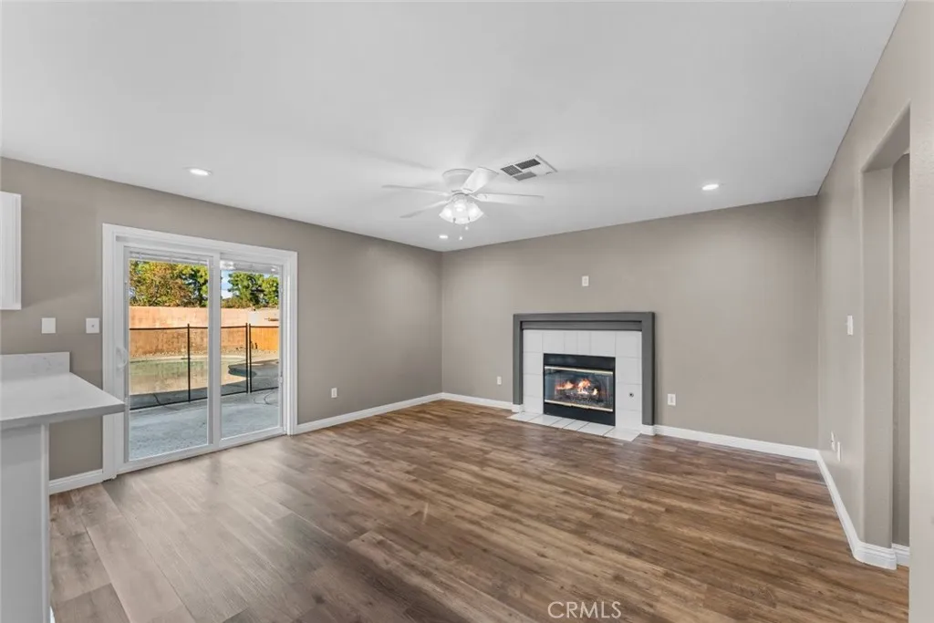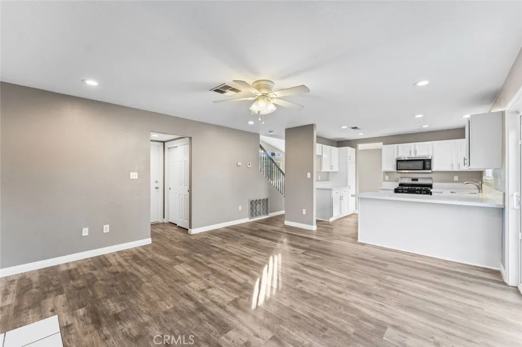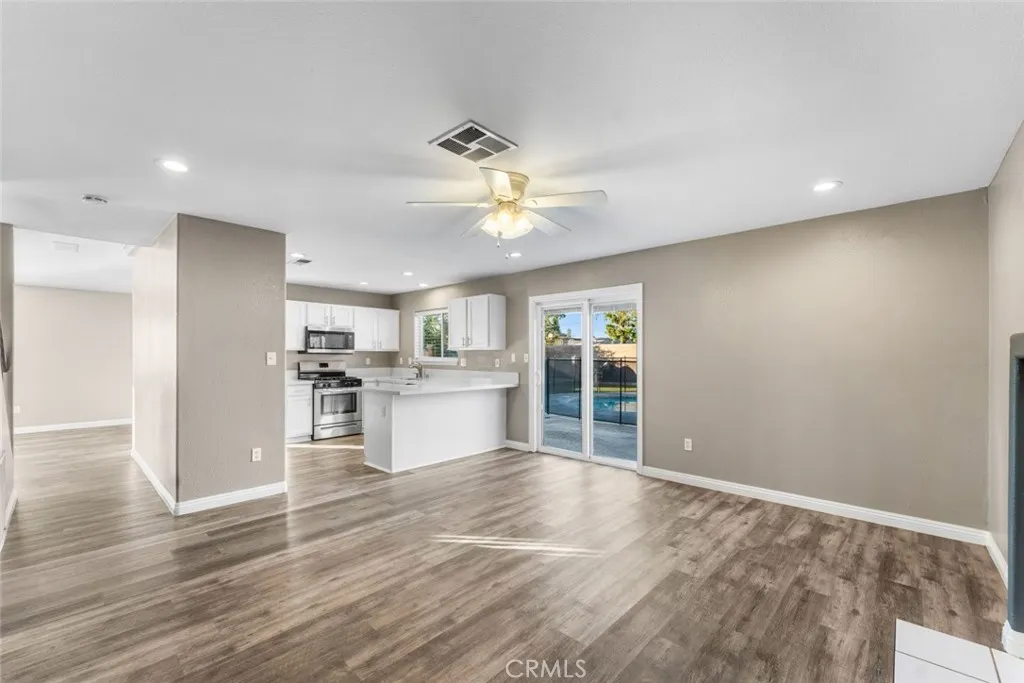 Upon entry, you’re greeted by an inviting living room highlighted by a cozy fireplace, wood-style flooring, recessed lighting, ceiling fans, and high ceilings that create an airy, open atmosphere. The open floor plan seamlessly connects the living area to the dining and kitchen spaces, perfect for both entertaining and everyday living.